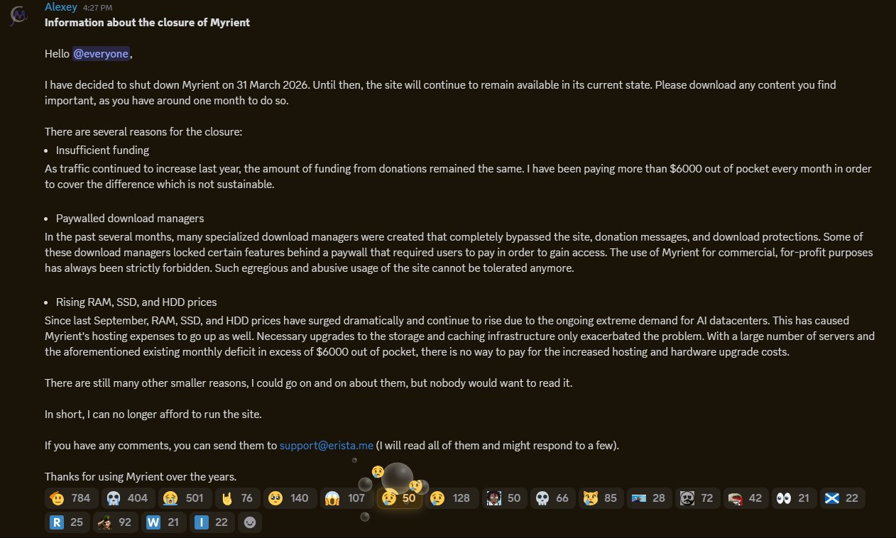 Печальная новость. Сайт архив ромов и образов консольных игр https://myrient.erista.me/ закрывается 31 марта. Автор говорит что нет средств его содержать, а донаты не покрывают расходы. Это был очень годный сайт я скачал оттуда кучу образов для пс1 пс2 и пс3.