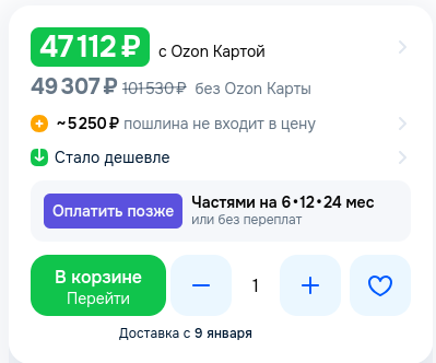 >>2569589 >цена там может и как на вб, но к этой цене можешь сразу +5к за таможенную пошлину плюсовать Кек, у тебя на скрине 53к, а на озоне - 48к плюс 5 пошлина.