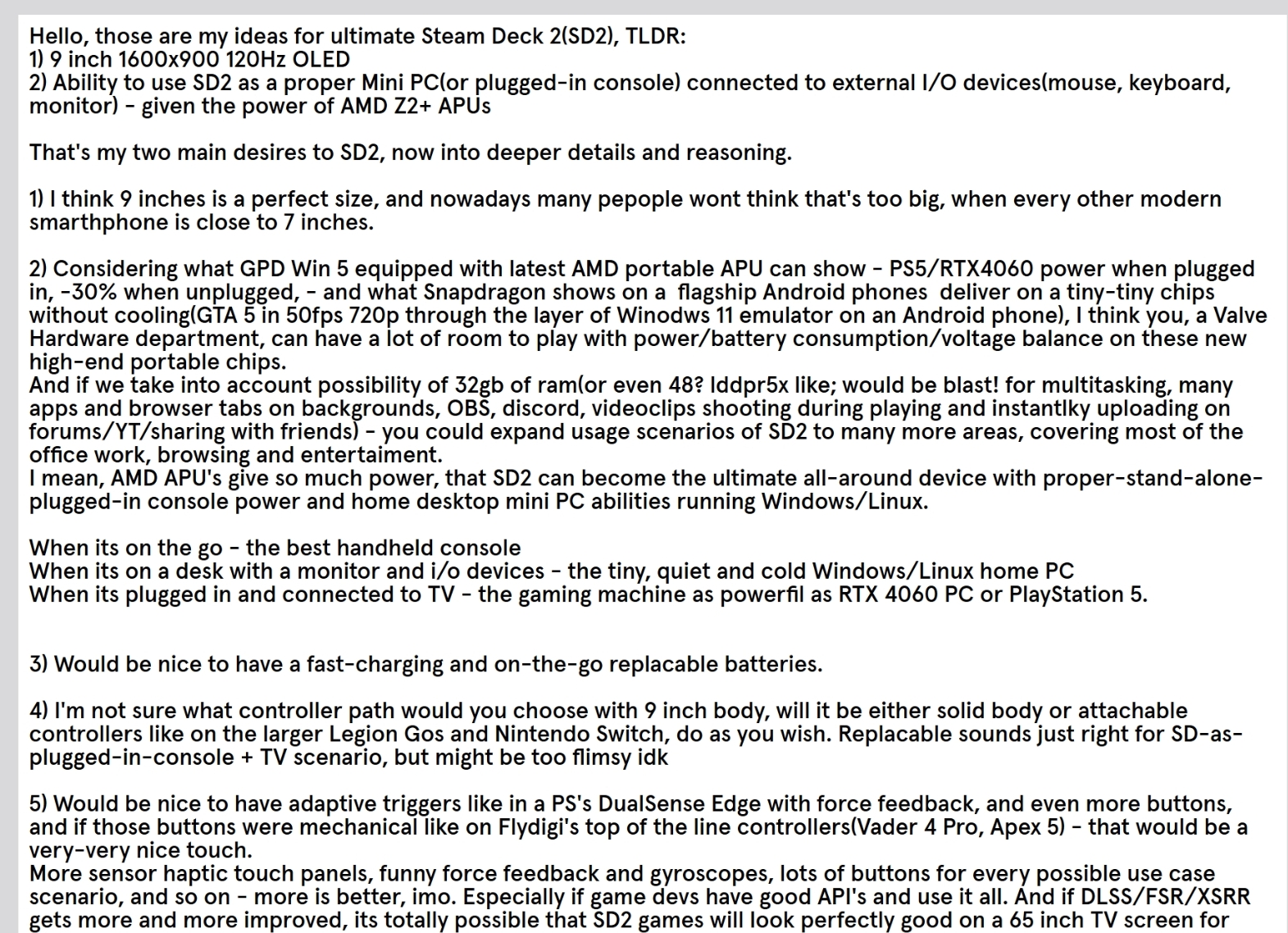 хочу стимдек 2 9-10 дюймов, на куалкомме 6Х холодном быстром 32гб/48гб(для ии/запис экрана/юраузера) и 2тб, олед 240гц 1920х1200 или 1600х900р, тонкий, аккум на 6ч+ игры с бытстрой (пере)зарядкой, стик и кнопки и триггеры как у дуалсенсе и apex vader 5 pro, микрофон с отсечением шумов еще и имитацией дальности как в арк райдерс. будет имба за 550 баксов.