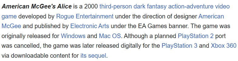 >Это пука игра и по сути и была только в виде длс на Алису новую для бокса и пс3. Кек, нипалимся ниразу-ни-зумерством что первая вышла на пс2, где я в первые её и увидел.