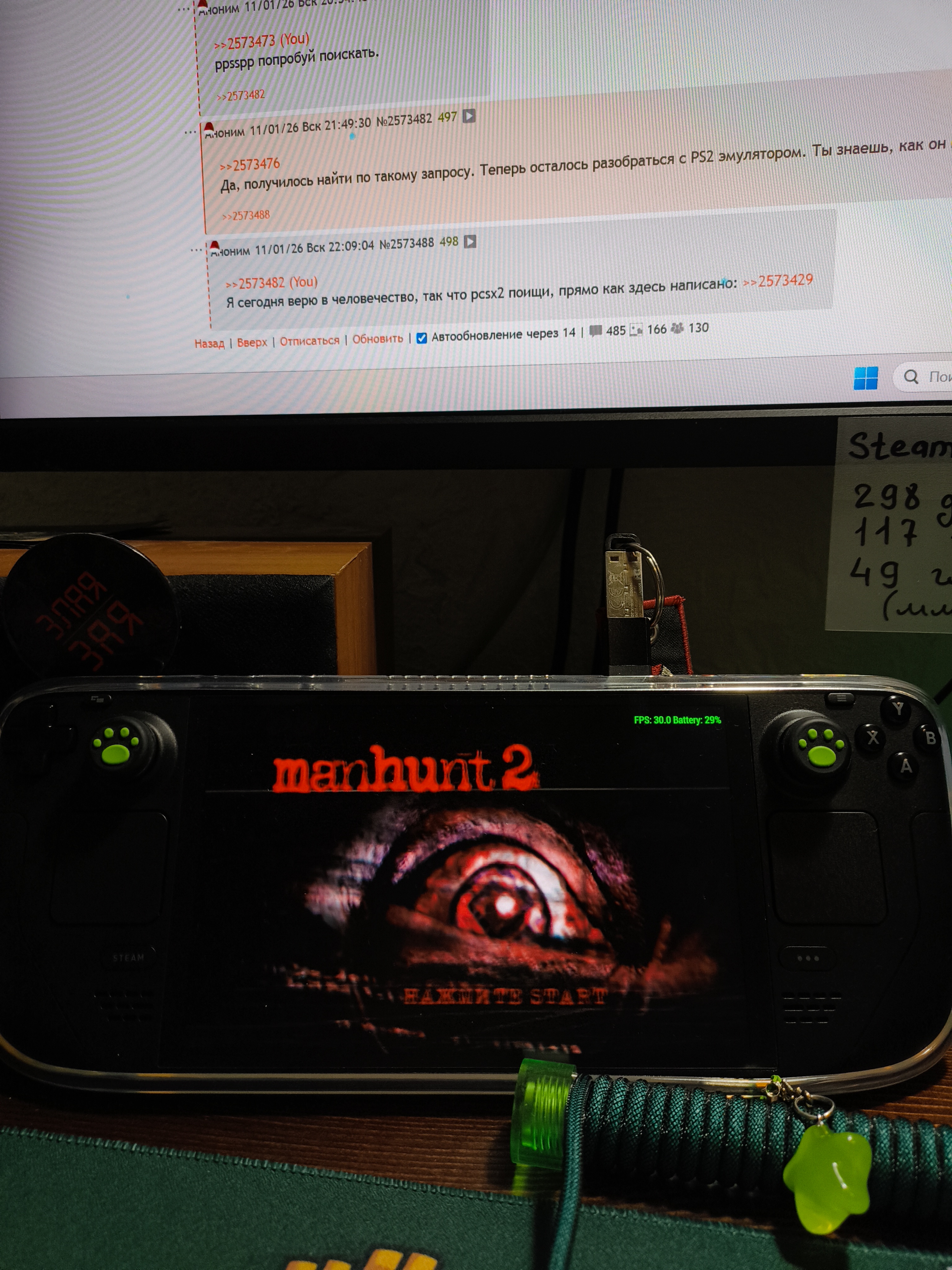Q: Где и как купить этот ваш этот стимдек? A: Ozon, WB, DNS, Авито или любой другой магазин или продавец с отзывами. Будь внимателен и не торопись, цена на одну и ту же версию в разных местах может отличаться чуть ли не в три раза. Q: Какой объём брать? A: 256Гб хватит если играть по две-три игры за раз, ещё для индюшатины место останется. Берёшь 64Гб — сразу бери SSD на замену (её сделать довольно просто), WD-SN740 или Samsung pm991 к примеру. Либо докупай качественную SD-карточку, например SanDisk Extreme Pro или Samsung Pro Plus. Q: В ААА не поиграть? A: Поиграть. Относительно свежие ААА дают 30 кадров и более в средне-низких. Недавно завезли losless scaling. Q: А стримить с ПК можно? A: И это можно, отлично работает стимлинк, мунлайт, экспириенс по отзывам крайне положительный. Q: Сколько держит батарея? A: Зависит от выставленных настроек фпс, TDP, яркости и самой игры. От 1.5ч в традиционно неоптимизированном кАААле до 6ч и более в безграфонном инди. OLED-версия живёт от батареи на 10-20% дольше. Q: Как устанавливать пиратские игры? A: Перенести установленную (или портабл) папку с игрой с компутера на дек и "добавить" её EXE-файл в Steam. Способов переноса несколько, гугл в помощь. Либо поставить на дек торрент-клиент и скачать игорь сразу туда. Q: Закатил в дек пиратку, а она лежит в библиотеке серым кирпичом, хочу обложечку! A: Ставишь decky — сборник плагинов. В нём SteamGridDB — плагин для удобного навешивания артов и обложек. И ещё много всякого. Q: Эмуляцию завезли? A: Естественно. Есть отдельные эмуляторы во встроенном магазине приложений (где всё бесплатно), есть Emudeck. Все основные эмуляторы в нём уже есть. PS3 эмулируется так себе, от игры к игре, Switch эмулируется неплохо, 40 кадров наберётся. Q: Хочу установить Шиндошс / переустановить SteamOS! A: Дек прекрасно загружается с флэшки, шаманишь Rufus'ом, втыкаешь в консоль через OTG-адаптер и вперёд. Можно сделать дуалбут, но придётся делить SSD на две части. Q: Он тяжёлый? A: Тяжелее большинства портативок, но отличная эргономика и продуманный дизайн делают своё дело, дискомфорта при долгой игре нет. Q: Заведётся ли игра_нэйм на деке и будет ли нормально работать? A: https://www.protondb.com/explore, но с вероятностью 99.9% всё заведётся и работать будет. Q: А вот посмотрите [очередной_стопицотый_"УБИЙЦАстимдека"], он жи лутьши))) А: Отлично, мы за тебя рады, пройди в тред по нему, а если нет - создай. Q: Что насчёт Стимдек-2? Когда будет? Что внутри? Может, подождать его? А: На данный момент кроме слухов ничего нет. По словам вальвы вторая версия выйдет только когда будет прорыв в технологиях. Ждать смысла нет, текущий стимдек отлично держится и будет держаться ещё долго - играет эмуляторы и старьё, а немалая часть свежайших релизов имеет специально заточенный под него пресет настроек графики. Q: Ваша шапка гавно, у меня ещё куча вопросов! A: Как ни странно, гугл. Одно из (можно сказать, решающих) преимуществ дека — огромное и активное коммьюнити в стиме, реддите и куче других сайтов, а ещё триллиард видев на slowтюбе. С вероятностью 101% твою проблему уже обсосали и решили.