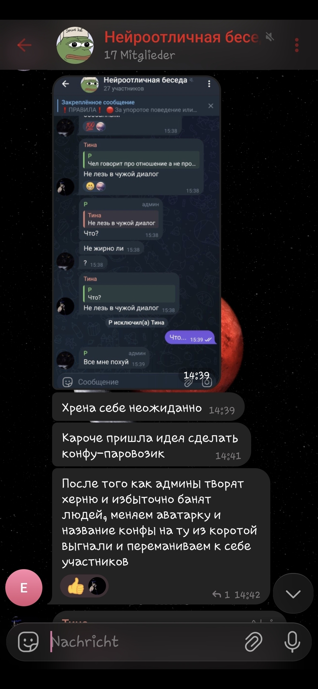 Тролли обиделись, что их выкинули из конфы, и хотят умыкнуть беседу, чтобы троллить аутанов. Смотрите историю треда, читайте скрины здесь >>298515 , настоящая ссылка всё ещё прежняя: https://t.me/+kT7zeTo863VjNDEy