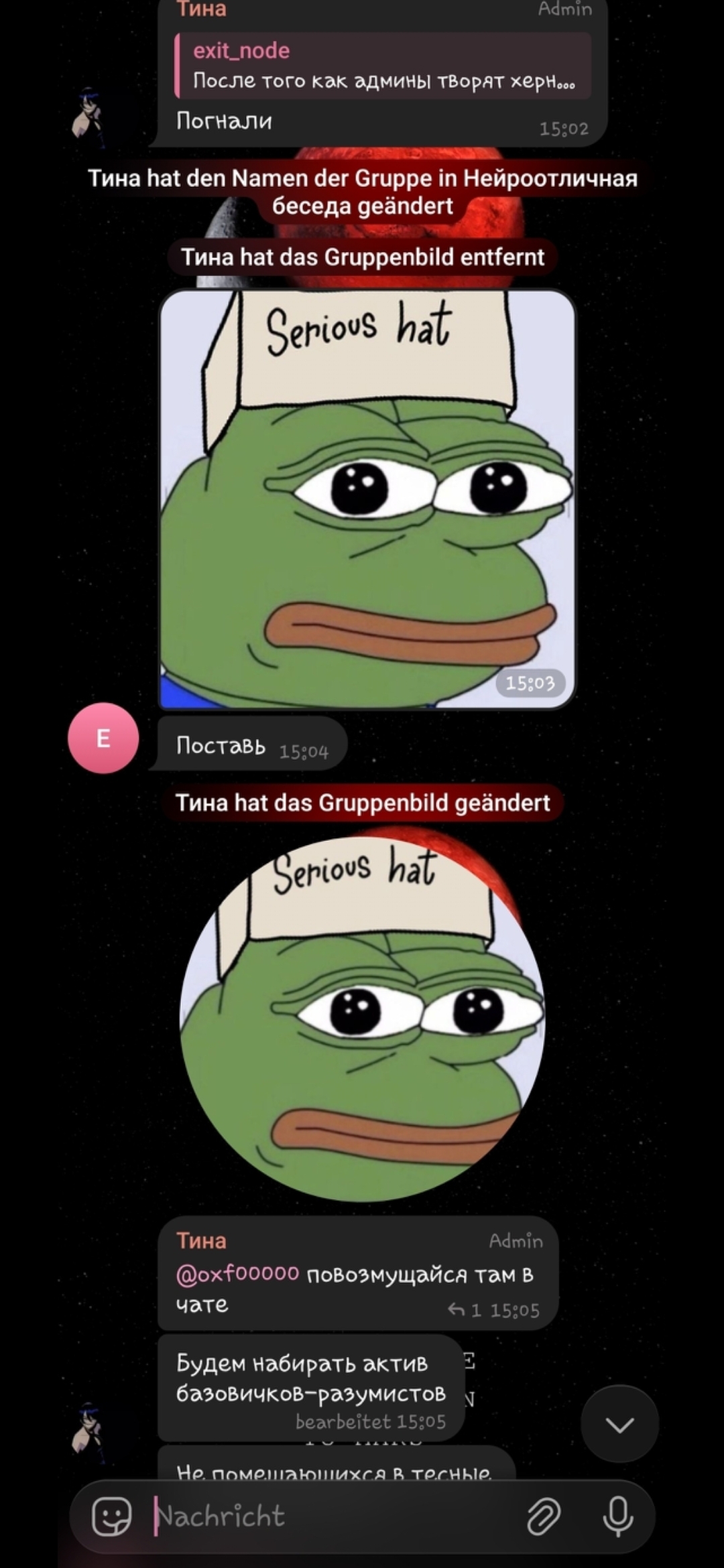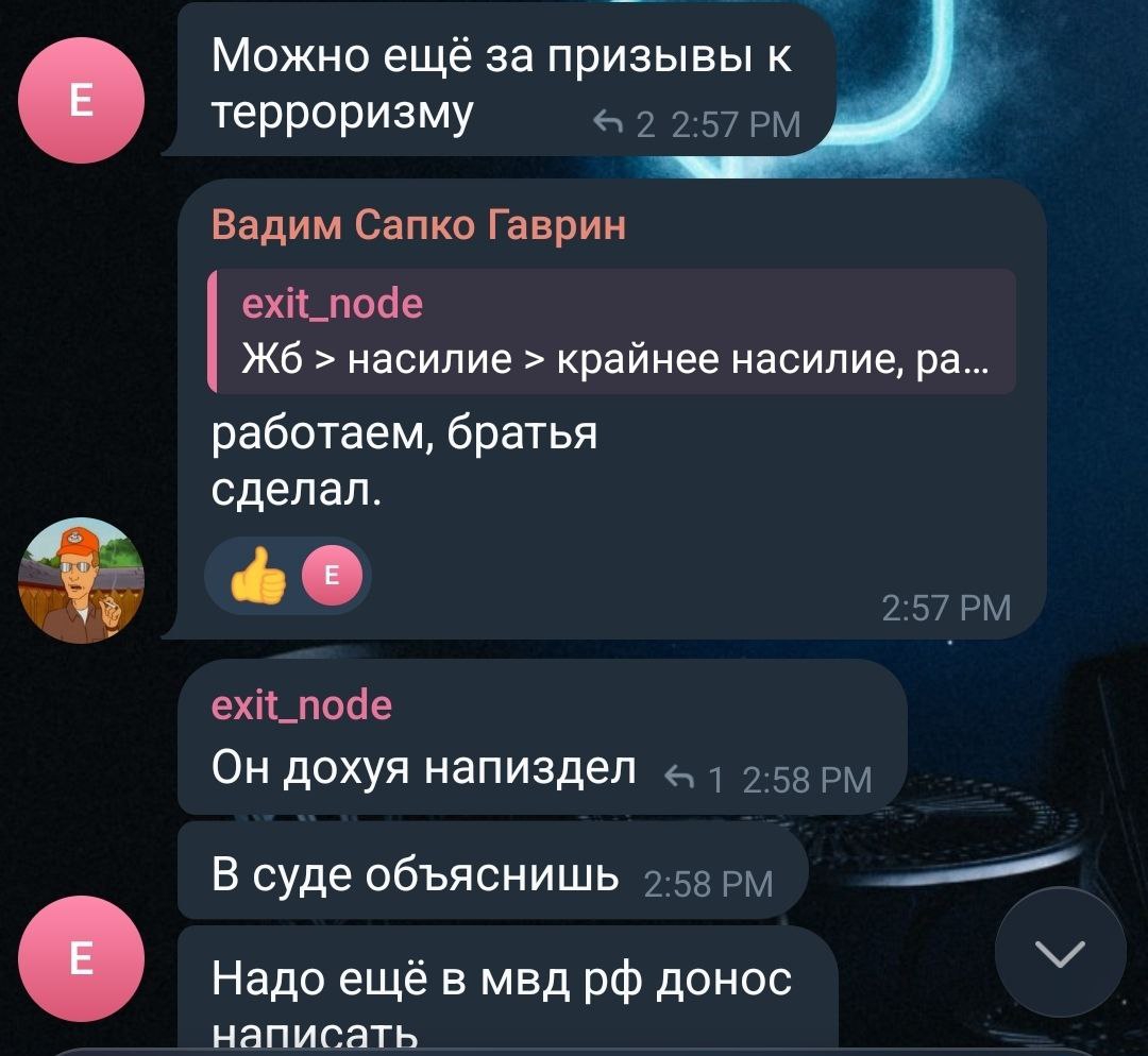 >>299549 В этой говноконфе сидят петухи-доносчики. Крайне не рекомендуем туда никому заходить. И админам других чатов рекомендуем обратить внимание на этих персонажей и вычистить их из своих конференций, если они у вас числятся.
