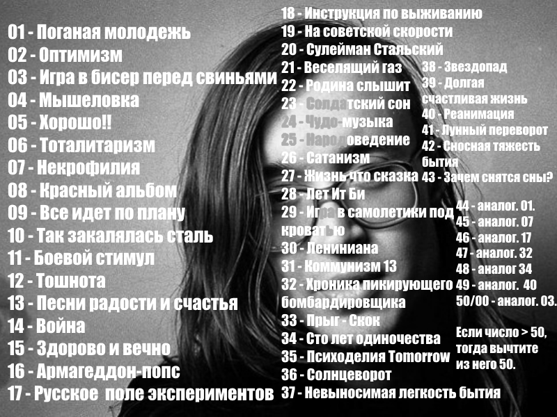Я ненавижу красный цвет или Да будет анархия? Всем насрать на мое лицо или Эй,бабища,блевани? Дедушка Ленин хороший был вождь или Ленин - это истины,которыми нас травят? Цель у нас едина - суицид или Никто не хотел умирать? Мы в глубокой жопе или Всё идёт по плану? Человек человеку волк или Давайте будем жить-вперёд?