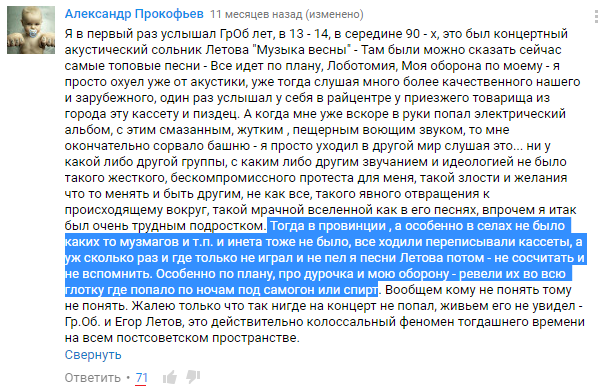 Я помню, как его в свое время хвалил Оксимирон, и тысячи хомяков стали ему поддакивать, хотя до этого каждый бы назвал его говнарем. Плюс, шизофазические тексты вызывают смех у некоторых, поэтому и появилиссь мемы с ним. У кого-то зашкаливает элитизм, ясен хрен, лоуй-фай, постпанк в перестроечное время, быдлу не понять. А кто-то вроде меня слушает его уже сто лет, потому что нравятся его песни. Говнарьское прошлое никуда не уходит.