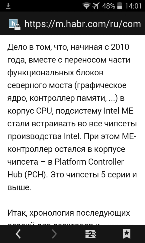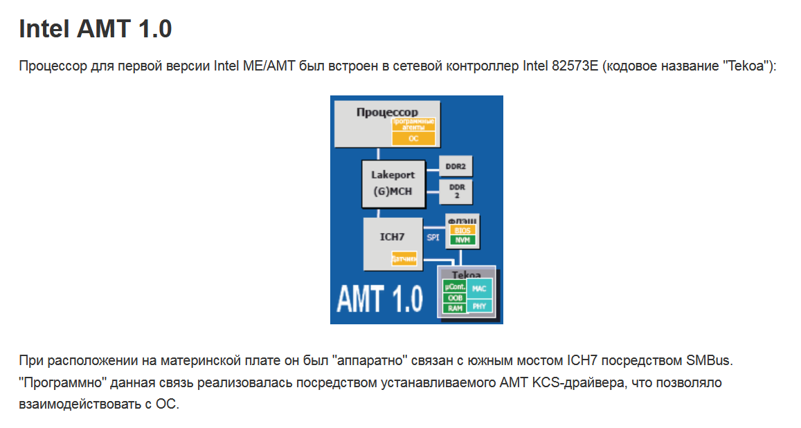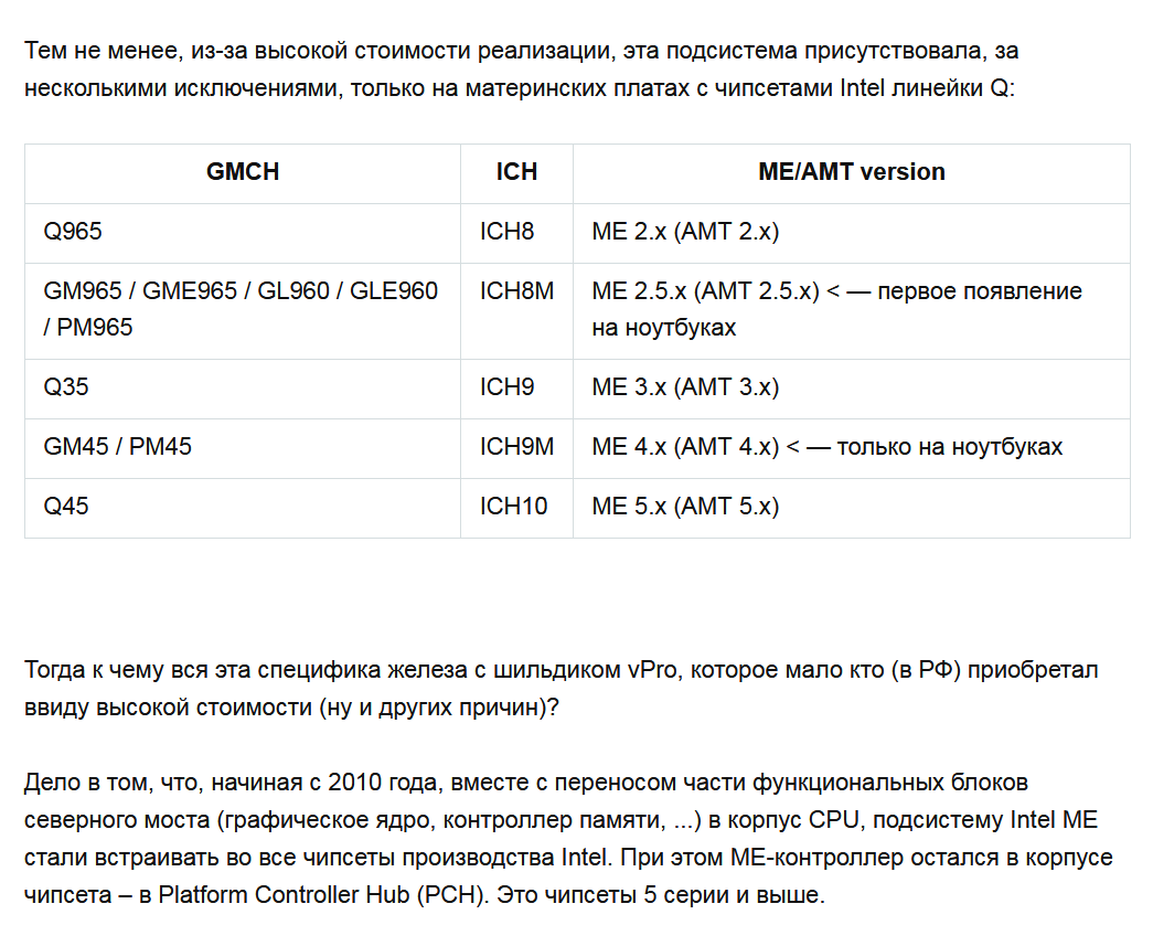 >Какого ещё процессора Вроде как intel ME располагается прямо на процессоре. Точнее в его шине, но как я понял, не в чипсете. Не уверен в этом на 100% конечно, но учитывая что в одних процессорах есть vPro, а в других стоит простой Intel ME, то как бы логично предположить, что эта шняга сидит в процессоре.
