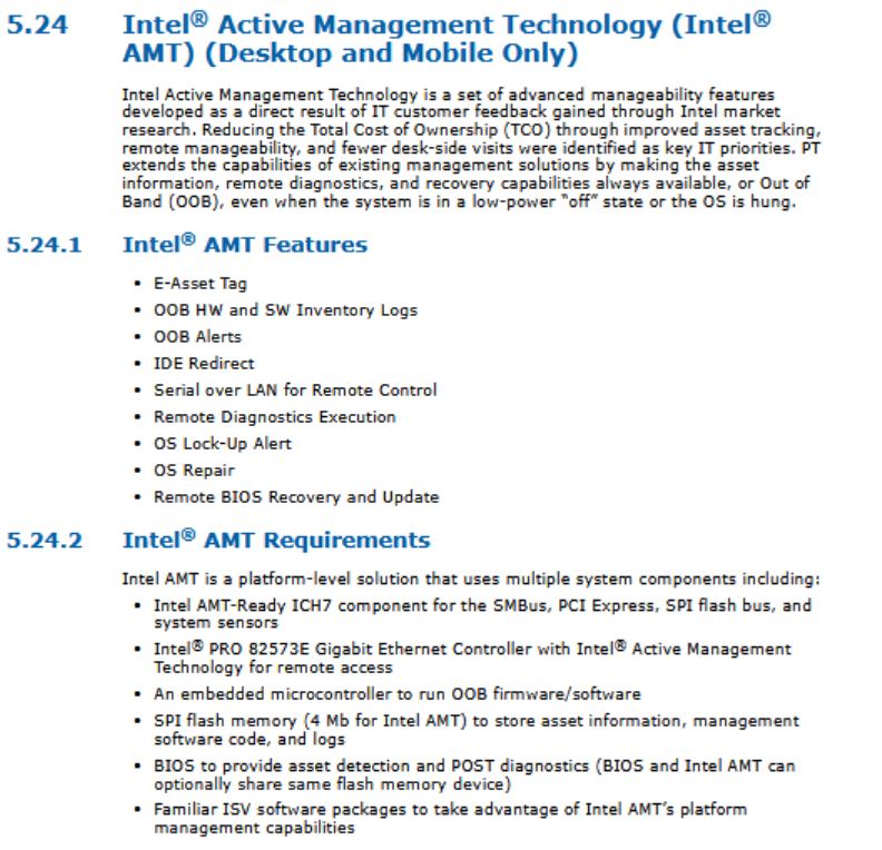 >>20987 эта хуйня, грубо говоря, ещё один мелкий комп в компе. То есть эта мелкая хуита является как бэ аппаратным радмином к твоему основному компу... Если ты его выпилишь - не сможешь загрузиться, тк там при загрузке проверяется наличие этой хуйни...