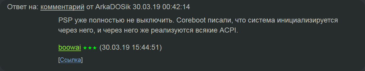 >>46735 Так, стопэ, если на AMD это можно отключить хотя бы формально, то это значит, что важные функции туда по крайней мере официально не перенесены, как это сделано с процессорами Intel. Это раз. Два, intel ME не находится в процессоре, это плата на материнке с собственным процессором и ОС. Не значит ли это, что банальная шифровка спасает от неё без особых проблем?