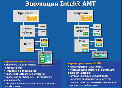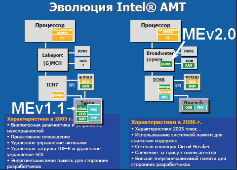 а) На CCC каждый год несколько докладов о безопасности прошивок персональных компьютеров, там и ссылки на документацию от производителя есть, и техническое обсуждение. Просвещайтесь. б) Версий IME несколько, они разные. Первые умели не намного больше, чем Wake-on-LAN. (Например, могли сетевой трафик сравнивать с образцом и блокировать/уведомлять при совпадении. В начале двухтысячных в возможность сделать винду безопасной никто не верил, эпидемии червей регулярно клали локальные сети, поэтому предполагалось такое решение, блокирующее эксплойты на виндовые порты уровнем ниже ОС. Ещё, пожалуй, можно было реагировать на передачу помеченных документов через незащищённый канал, когда ноутбук находится вне контролируемой сети, но это довольно наивная защита, в основном от глупых пользователей.) в) Хоть предположение о возможности глобальной слежки за любым компьютером и вызовет слюноотделение любого разведчика-тире-шпиона, надо признать, что они тут оседлали имеющиеся на рынке спрос и предложение. IME — не первое и не единственное такое решение для корпоративного использования. (Вон, Apple любой айфончик в мире может заблокировать при первом же обращении к её сервисам.) Всё это сделано для удобства админов, которым не хочется вручную жонглировать сотнями компьютеров, колхозить системы шифрования и защиты от утечек из открытых или узкоспециальных программ, а потом рвать на жопе волосы из-за потери ноутбука в ждущем режиме с открытыми программами. Нажал кнопочку — корневой ключ шифрования удалился из флеш-памяти, девайс стал бесполезен. Нажал другую — видишь всё, что происходит на экране, независимо от операционной системы, видеорежима и стадии загрузки. В серверном мире KVM никого ведь не удивляет, не говоря уж про управление виртуалками. г) Из нацеленности на корпоративный сегмент следует, что IME доступен не во всех компьютерах, а только в профессиональных, сертифицированных и т. д. продуктовых линейках от партнёров и дилеров. Каждый хочет получить за дополнительную функциональность денежку. Это не значит, что сборщики BIOS'а для вашей материнской платы корректно отключили его инициализацию, а не просто спрятали экран настройки, что у Intel нет волшебного слова, которое включает бизнес-ориентированные функции на любом совместимом железе, и что хитрым обращением к имеющимся компонентам нельзя вызвать отказ системы (обновление БИОС на пустое место, например). Просто обычными утилитами с типичным компьютером сделать ничего нельзя. д) Технические ограничения тоже присутствуют: сетевая карта и материнская плата должны уметь при работе от дежурного питания полноценно взаимодействовать с IME, видеокарты, скорее всего, только встроенные позволяют копировать буфер экрана для передачи по сети. Тут беспокойство вызывают ноутбуки, у которых зачастую вся платформа разработана Intel и лицензируется целиком разными производителями. е) Надо различать рекламные заявления и техническое воплощение. Хотя возможность выполнить любой код на уровне BIOS автоматически означает возможность манипуляции памятью ОС и выполнение любого кода в ней, значительная часть предлагаемой функциональности реализована традиционно, программным агентом. Например, «установка любых программ» может проходить так: административное приложение рассылает всем включенным и выключе