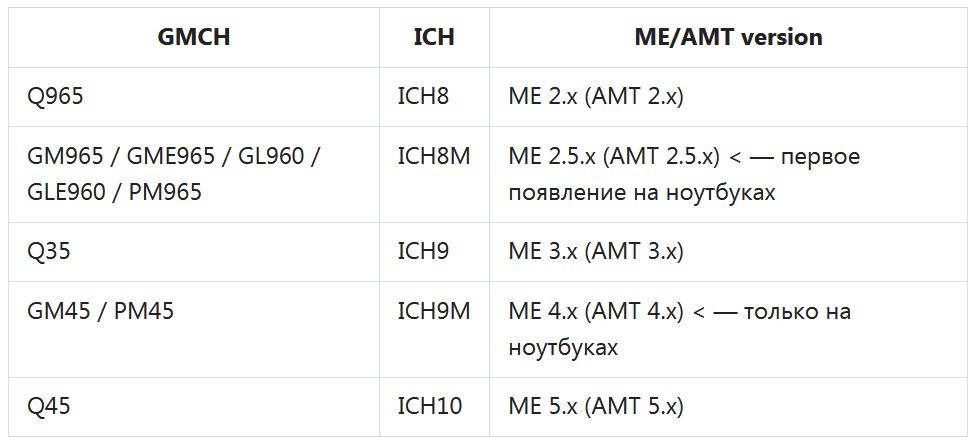 >>ME был во всех чипсетах новее p965 включительно Обязательным этот зонд стал начиная с 5-й серии чипсетов А до этого был только в Q. Пик2 И в любом случае на 775 прошивка МЕ удаляется полностью без следа. На более поздних платформах удаляется только часть прошивки, некоторые модули остаются