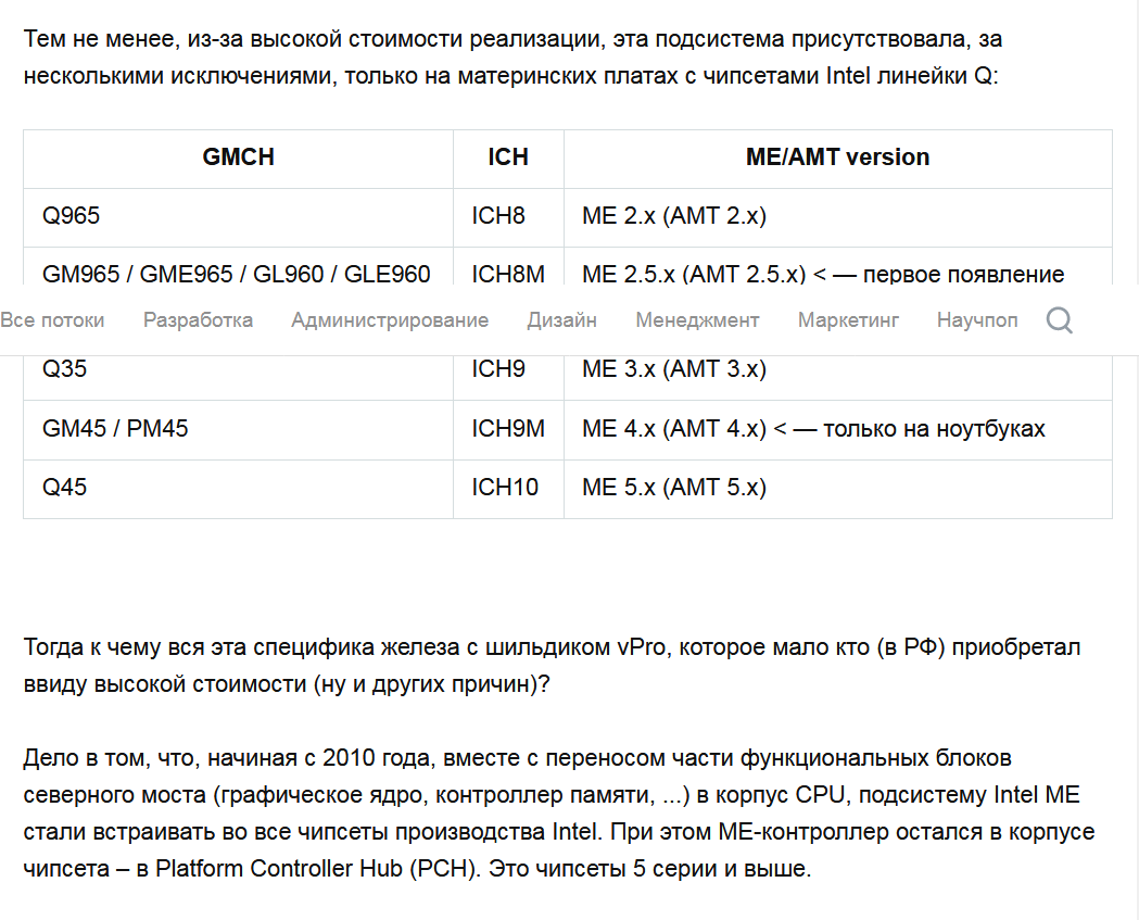 ...начиная с 2010 года ... подсистему Intel ME стали встраивать во все чипсеты производства Intel. При этом ME-контроллер остался в корпусе чипсета – в Platform Controller Hub (PCH). Это чипсеты 5 серии и выше... https://habr.com/ru/company/dsec/blog/278549/ Я правильно понимаю что МЕ стал обязательным компонентом начиная с платформы 1156?