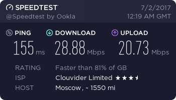 >>34799 Соуса нет >>34796 Поставил openvpn, пикрил тесты на канале 30 мегабит, второй пик до ростелекома в москве. IP кстате как это не странно здесь не в бане, можно даже подвачевать с впна