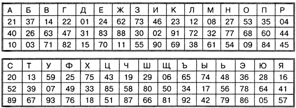 Приведем теперь «революционное» задание в этом этюде. На руках вы имеете сам шифр (стихотворные строчки); осталось только сообщить ключ к нему. Ключом служат следующие слова князя: «Каждая буква обозначалась словом и местом буквы в слове». Таким образом, мы имеем дело с действительно трудновзламываемым книжным шифром[85]. Только используемая «книжка-малышка» имеет всего лишь три строки, что значительно облегчит вашу работу в дешифровке следующего текста: