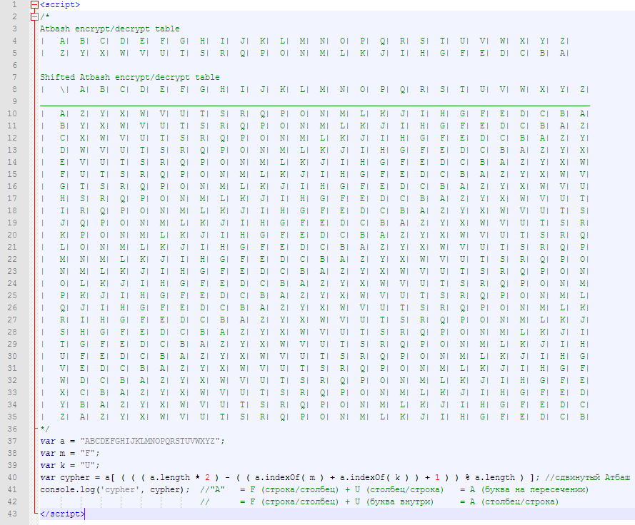 Ну а если применить дополнительный атбаш, то можно получить ещё один шифр, для и ещё одной формулы. Соответственно - там другая таблица (атбаш, сдвинутый и по строкам, и по столбцам). Все эти три таблицы - они взаимосвязаны через атбаш, и ими можно шифровать-дешифровать как сдвинутого атбаша, так шифр Виженера, так и шифр Бофора.