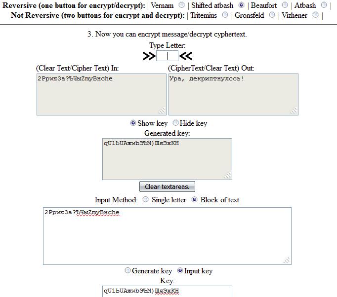 Ок. Обратная операция дешифрования - та же: шифртекст: Ключ: [ 15, 65, 82, 0, 215, 3, 4, 8 ] Шифротекст: [ 14, 63, 79, 252, 210, 253, 253, 0 ] Открытый текст: [ 1 2 3 4 5 6 7 8 ] Формула - та же: (256 + 15 - 14) % 256 ( (alphabet.length + k - c) % alphabet.length ) - повторное шифрование шифротекста ключем - при помощи шифра Бофора.
