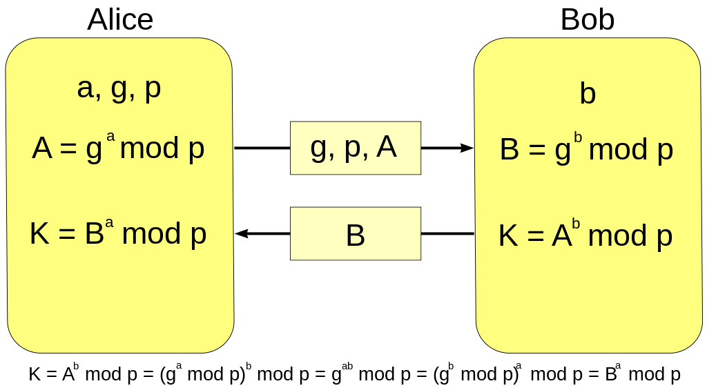 И ваще я планирую скоро Diffie-Hellman+AES прихуярить туда, чтобы данные в открытом виде не передавать по открытым каналам, а гонять шифр, между клиентом и сервером, в той же локалке. Например чтобы посты смотреть по локалке, чтобы постить, или чтобы базу синхронить между двумя серверами в локалке. Если по открытому каналу гнать всю инфу, она осядет на снифферах, а так там осядет шифр, потому что DH+AES. DHKE (Diffie-Hellman-Key-Exchange protocol), на пикрил. А чтоб его не MITM'али {g, p, A} сервера - должны быть прешарены. С этим можно работать, через BigInteger, на шарпе.