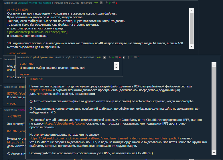 Ну и наконец, в контексте вышеописанного, чё-то взбрело в голову, вообще не юзать файлы-аттачи, а встраивать в посты - короткие ссылки, вроде magnet-ссылок, а хранение файлов-аттачей - вынести отдельно, и организовать в виде торрент-трекера, в той же пиринговой сети. Чтобы, как-бы, пиры, чтобы они были ещё и торрент-пирами, и чтобы раздавали аттачи через эти ваши децентрализированные торренты пирингообразные. Такая схема, позволила бы эффективно хранить однотипные файлы-аттачи. Например - пикчи с мемасами. которые постят чисто чтоб потроллить. 1000 постов с одной и той же пикчей, будут содержать одну и ту же магнет-ссылку, которая внутри поста, будет просто как текст. В итоге, вместо 1000 файлов, прицепленных к 1000 постам, будет будет сохранён лишь один, и надёжно диверсифицирован по торрент-пирам этим вот, децентрализованным.