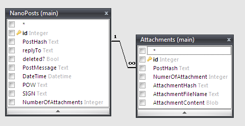 Пока, схема данных, такая (пикрил). Судя по всему, этого достаточно, чтобы однозначно адресовать по хэшам и нанопосты, и аттачи. В таблицах NanoPosts и Attachments, поля PostHash и AttachmentHash являются уникальными - первичными ключами, и коллизии могут быть исключены на этапе добавления данных в БД. Если NanoPost, добавляемый NanoPosts имеет коллизию, тогда, достаточно перегенерировать POW, и вставить этот же пост, но с другим хэшем. Если Attachment, добавляемый в Attachments имеет коллзию, и выдаёт тот же хэш, то тогда, можно игнорировать его добавление, ведь вероятнее всего - это тот же файл, к другому посту приклеили, и тогда, просто запись добавляется в таблицу NanopostsAttachments - безо всякого дублирования файлов.