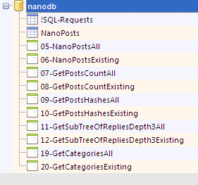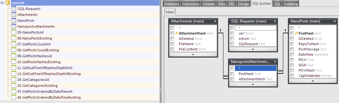Я пока на стадии "проектирования базы данных". Тот SQL-скрипт, можно запустить здесь в той софтине: >SQLite Expert Professional Edition v5.3.4.460 x86 & x64 + Portable и потыкать базу эту. Чтоб наполнить её, можно использовать SQL-запрос, вида: >BEGIN; >INSERT OR REPLACE INTO [NanoPosts]([IsDeleted], [PostHash], [ReplyToHash], [PostMessage]) VALUES(0, 'PostHash', 'ReplyToHash', 'PostMessage'); >INSERT OR REPLACE INTO [NanoPosts]([IsDeleted], [PostHash], [ReplyToHash], [PostMessage]) VALUES(0, 'PostHash1', 'ReplyToHash1', 'PostMessage1'); >COMMIT; где PostMessage - JSON-serialized сообщение, в котором одинарная кавычка ' заменена на две такие кавычки '' .