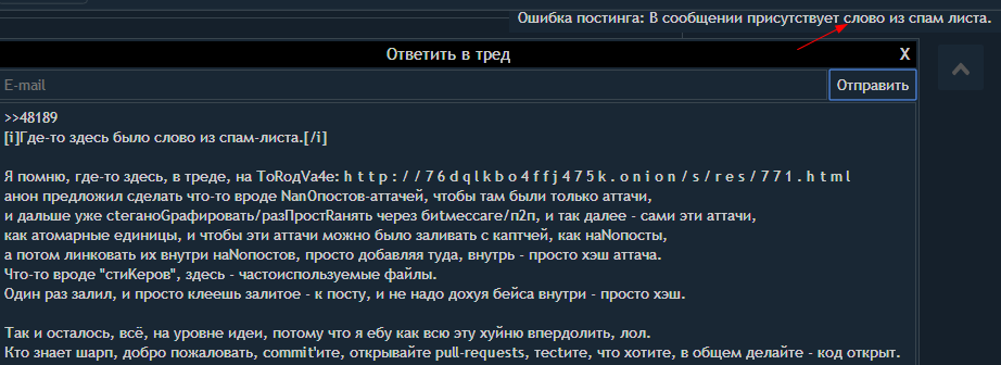 >Мало того, распространяя контейнер, ты распространяешь даже то, >что не очень хочешь распространять и вероятность попадания туда незаконной хуйни весьма велика. Чтобы этой хуйни не было, есть опциональная возможность выбрать нанопосты, пакуемые в контейнер, исключив оттуда то, что не хочешь паковать в свой личный белый контейнер. Но можно и не выбрать, и по дефолту впаковать всё вкупе, тогда срабатывает схема отрицаемого шифрования, так как сложно доказать, нанопост ли самого автора попал в контейнер, или же это просто алгоритм выбрал случайные посты каких-то других авторов. Наноны просто поднимают в локалке серв, постя там говно своё, жмакают кнопку "сгенерить контейнер", и говно льётся, а кто его впостил - хуй разберёшь. Может оно вообще, ещё и до этого уже было там.