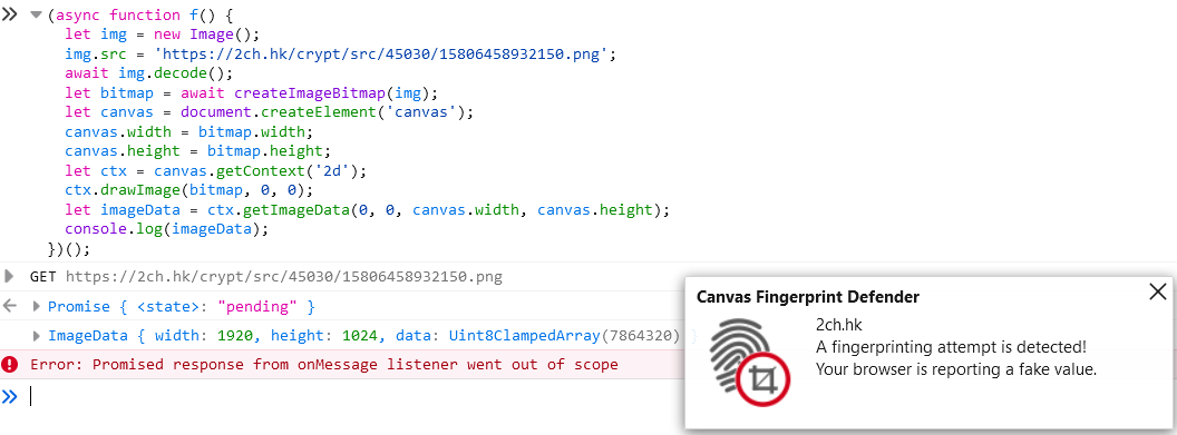 >>49101 Хуле доверять, когда можно посмотреть исходник. Там просто картинка масштабируется через канвас, а твоя хуита детектит это как фингерпринтинг. Она даже на простой getImageData ругается, лол.
