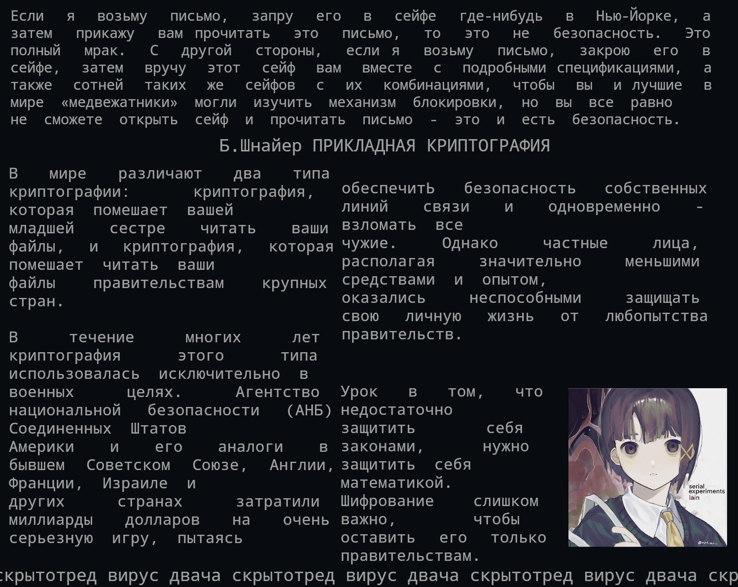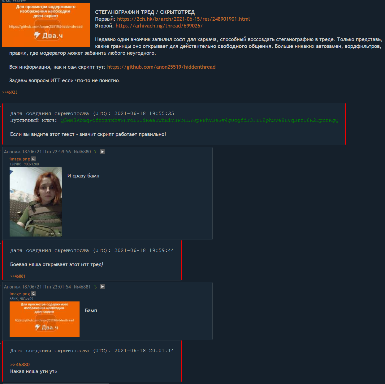 Недавно один анончик запилил софт для харкача, способный воссоздать стеганографию в треде. Только представь, какие границы оно открывает для действительно свободного общения. Больше никаких автозамен, вордфильтров, правил, где модератор может забанить любого неугодного.