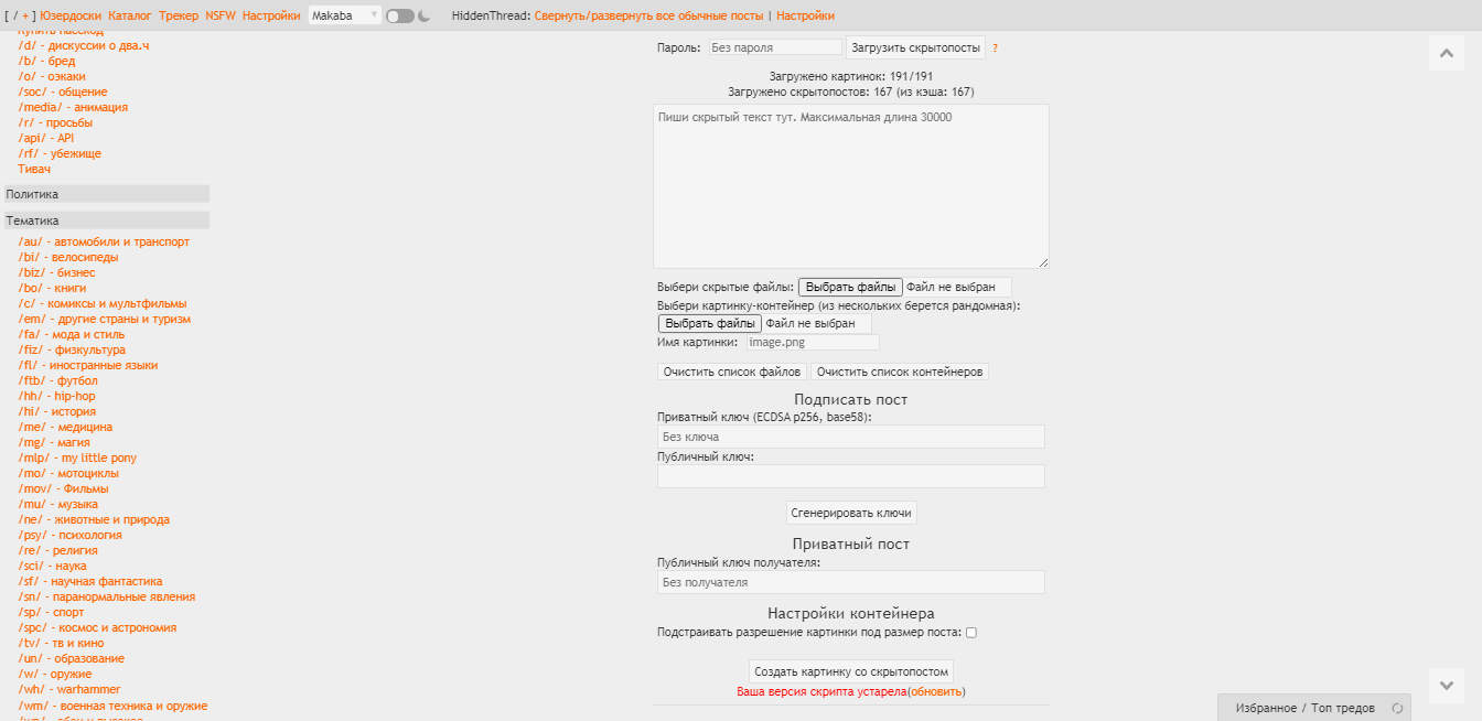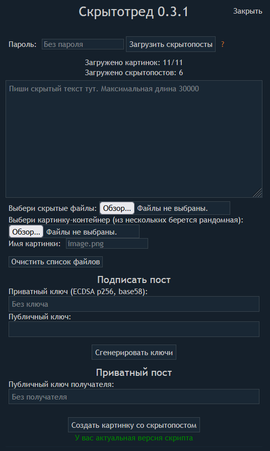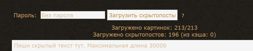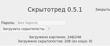 Как-то так будет выглядеть использование паролей, с ключами аналогично. Кнопка "загрузить скрытопосты" думаю вообще не нужна, т.к. посты и так будут расшифровываться сразу для всех сохраненных паролей. Только при добавлении пароля в уже загруженном треде надо будет один раз обновить страницу, чтобы предыдущие посты расшифровались со свежедобавленным паролем.