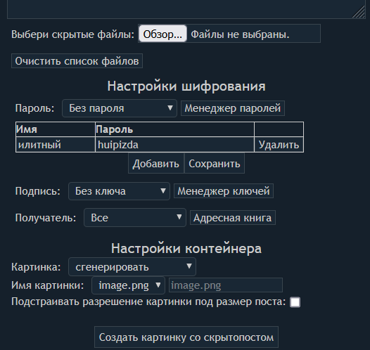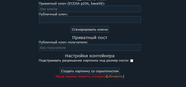 >>48587 А может лучше автоматическую очистку формы? Было бы удобней и привычней. Ещё бы в настройки добавить сохранение пароля и приватного ключа. И поддержку нескольких паролей одновременно (если такого ещё нет, не чекал).