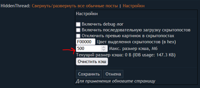 Добавил кэш, по умолчанию выключен, чтобы включить, надо в настойках скрипта поставить макс. размер кэша (этот тред например занимает ~17 Мб). Обычные посты тоже кэшируются, то есть скрипт не будет заново грузить посты, которые не расшифровались с определенным паролем или ключом. https://github.com/anon25519/hiddenthread/raw/dev/HiddenThread.user.js