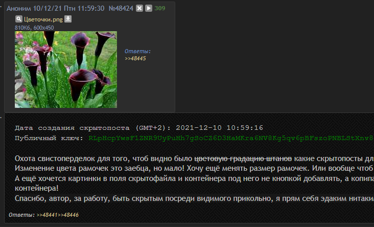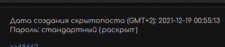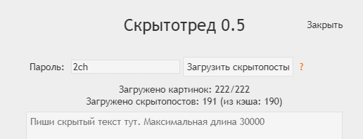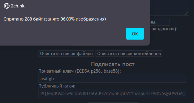 Если вы видите скрытопост со стандартным паролем "2ch", то у вас всё хорошо работает. Если после введение стандартного пароля и загрузки скрытопостов, вы не видите скрытопост данного контейнера, то у вас что-то не работает.