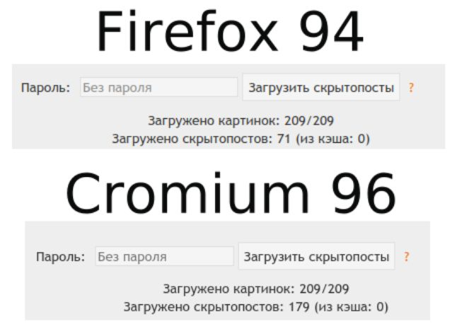 Сейчас в треде должна загружаться 221 картинка - это 180 скрытопостов через лису и 185 через хром, если очистить кэш и оставить пустой пароль и ключ со стандартным паролем еще +5 постов в обоих браузерах. Если у вас меньше, значит где-то ошибка.