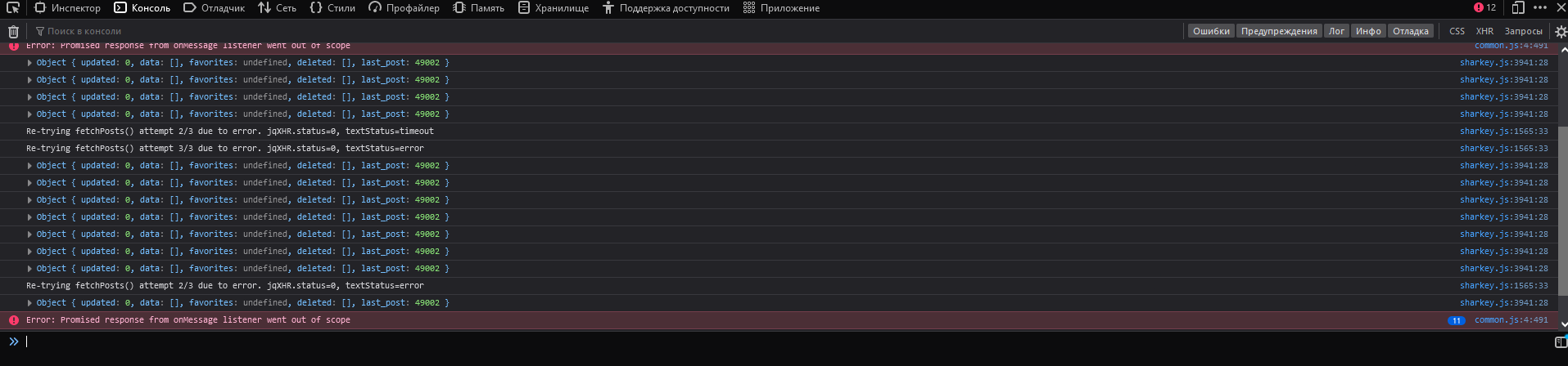 >>49000 >Что такое "неудачно" Это значит, что пикчи по какой-то причине не загрузились, смотри в консоли браузера причину, например как на пике. Но вообще в этом треде всё должно грузиться. >Раньше такого не было Сам алгоритм загрузки не менялся, я просто добавил отдельный счетчик. Раньше это выглядело бы как "загружено 114/121".