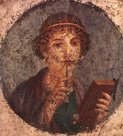 Сапфо к тому моменту уже шесть веков как умерла. Эта фреска - в римском вкусе I в. н. э. Не то чтоб совсем римлянка нарисована, конечно, - ей здесь придана некоторая приятная для римлян греческая утончённая "экзотичность". Но вообще на реальную Сапфо это похоже так же, как условные греческие пастушки версальских пасторалей - на реальных древнегреческих пастушек. Особенно эта сеточка для волос... (Есть более вменяемое скульптурное изображение Сапфо.)