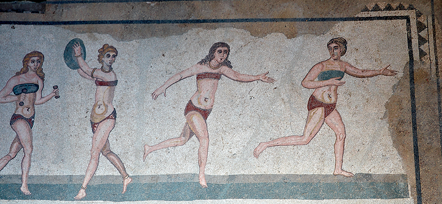 Как думаешь, когда вот эти довольно современно выглядящие фитнесистки в бикини с гантельками были нарисованы, например? III в. н. э. (Только не стоит по этому судить о всех античных фресках, тут художественный уровень невысокий, есть гораздо лучше. Интересна просто тематика рисунка.)