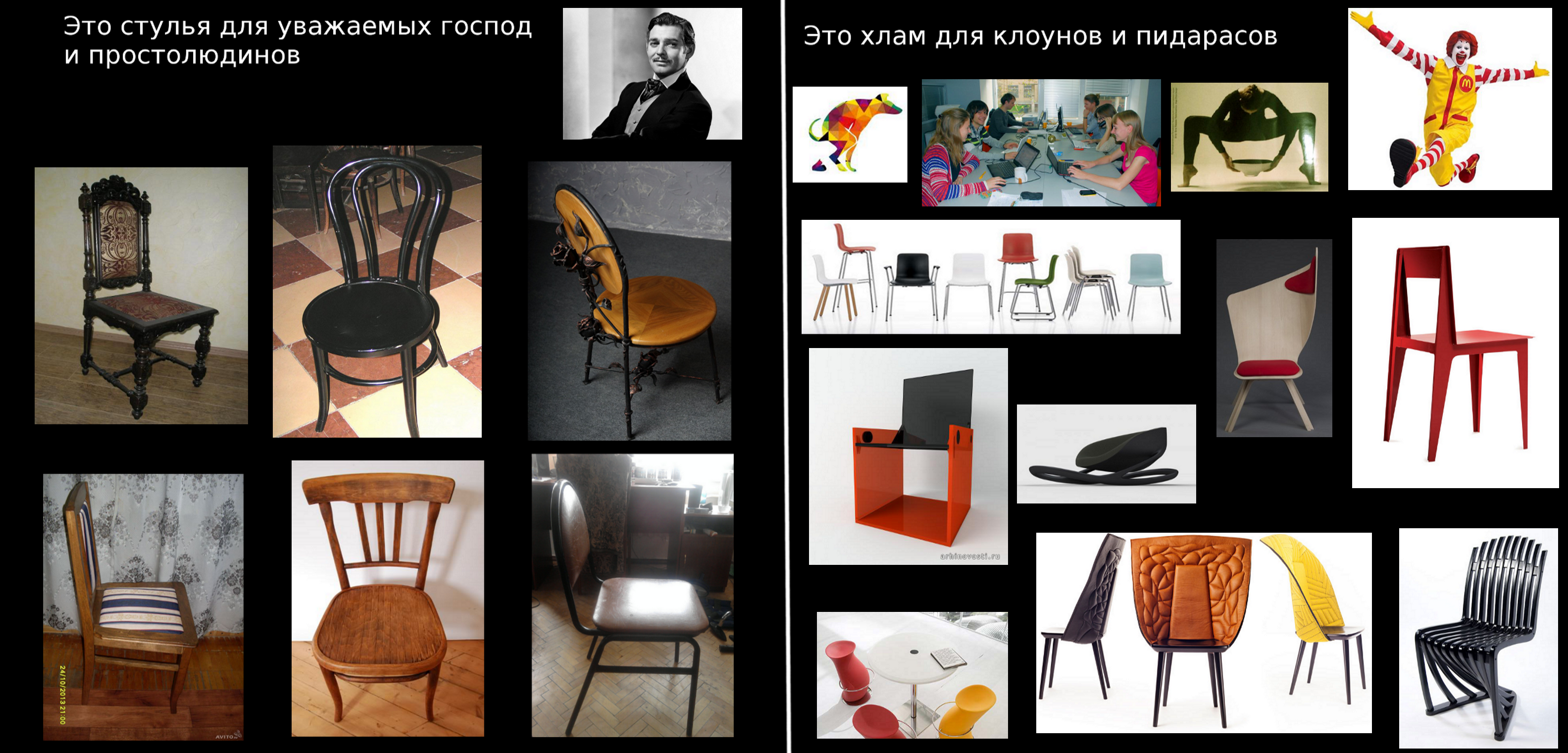 Справа же все линии и детали соучастники какого-то концепта. Мы не просто ножки, мы что-то ещё, мы дополняем картину продолговатой угловатости нашей спинки, и вообще я стул из страны продолговатой угловатости. А я стул-лепёшка! Вот это и есть дизайн-клоунада безвкусицы. Они хоть все и разные, но до ужаса одинаковы своей убогой креативностью. И почти всегда это вырвиглазные цвета.