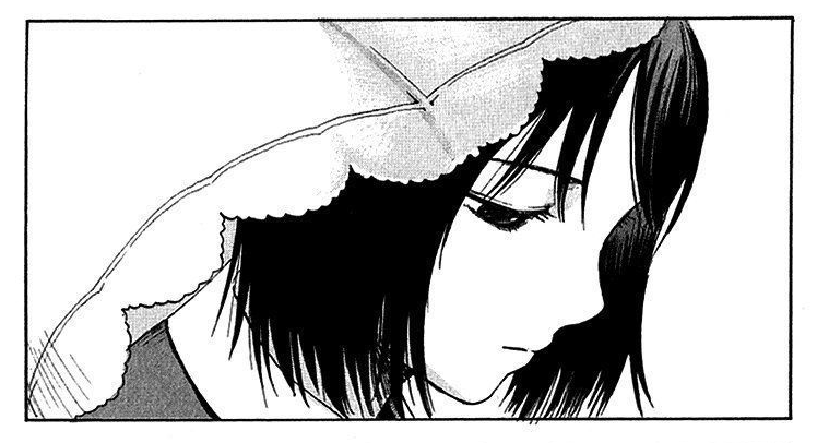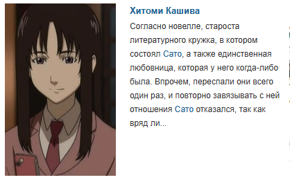 А ещё в аниме есть интересный момент, на который я с первого раза не обратил внимание. Школа, комната литературного клуба, и семпай с перебинтованными запястьями. Очевидно, после попытки суицида, хотя прямо об этом не говорится. И Сато её ещё отчитывает за эту попытку. Но тоже так, что сразу не поймёшь.