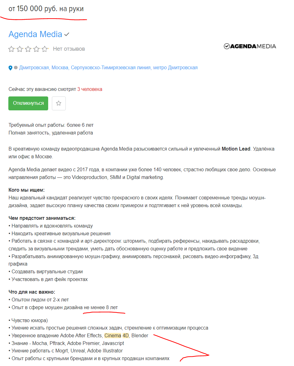 Сейчас особо предлов нет, поэтому сам полез на биржи фриланса и ахуел. Вообще ничего нет. Буквально. Одни 3D SENIOR ARTIST и VFX MASTER. Ничего хоть немного связанного с моушн дизайном не наблюдаю.