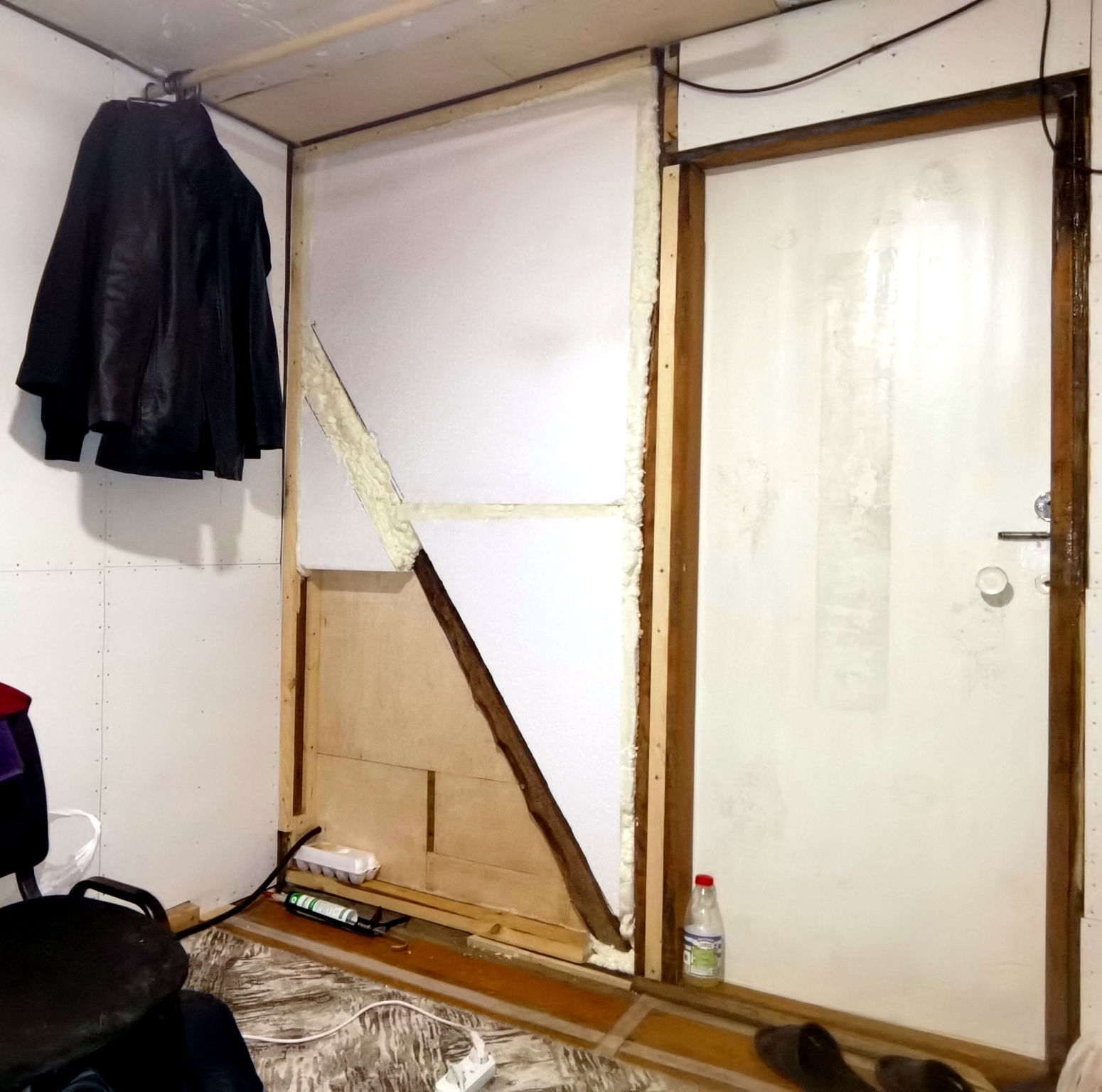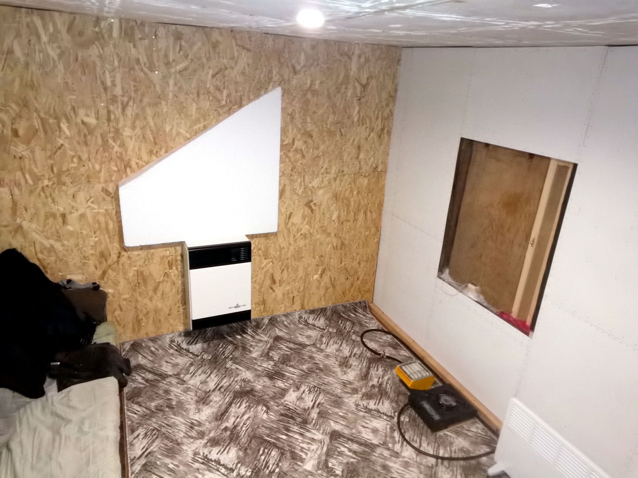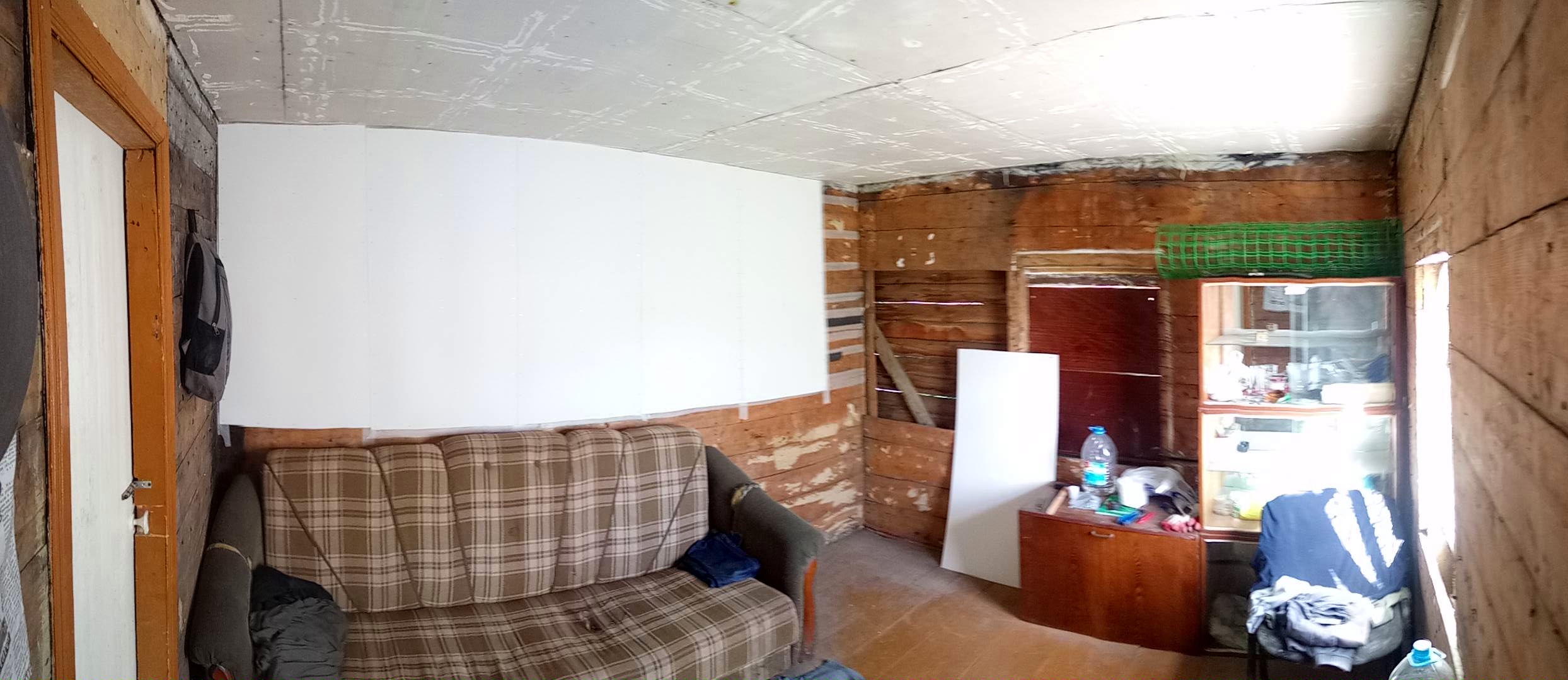 Пенопластом 100мм. Вот на фото видно. Моя первая зимовка в феврале 2024-го выглядела так. Полы, стены и потолки ещё не были обшиты. Заклеил щели в полах армоскотчем, постелил ковёр, и так зимовал две зимы. Зимой было около 10-20 градусов мороза в самые холода, не Урал. Первую неделю обогревался тепловентилятором на 2 кВт. Думал взять на постоянку потолочный ик обогреватель, но остановился на конвекторе. И не прогадал. Ресанта ОК-2000 работает второй год, в режиме нон-стоп, всю осень, зиму и весну. В этом году в мае выбросил старый диван, который уже сыпался и мешал утеплению пола. Поэтому до сих пор сплю на полу, на лежанке из звукоизоляции 50 мм. Пол почти доделал, осталось достелить около 3х кв. метров. Стена, что на фото, за диваном, до сих пор не обшита OSB, а просто заколочена листами двп. В этом году сделал систему приточно-вытяжной вентиляции. Над дверью приточный канальный вентилятор, встроенный в стену. Вытяжной, на 12 вольт, стоит в душевой кабине. Если включать только вытяжку, то работает тихо и сильно не дует, что очень удобно. Приточный работает мощно и громко, хочу заказать на него умное реле с пультом на 4 уровня скорости. В приложении можно настроить периодическую вентиляцию или по событию. Освещение в комнате и в тамбуре тоже работает через умное реле. Утром включается свет в комнате, вечером, перед сном, сам отключается. В тамбуре свет включается на 10 минут и автоматом выключается - так настроил, а то иногда забываю выключить.