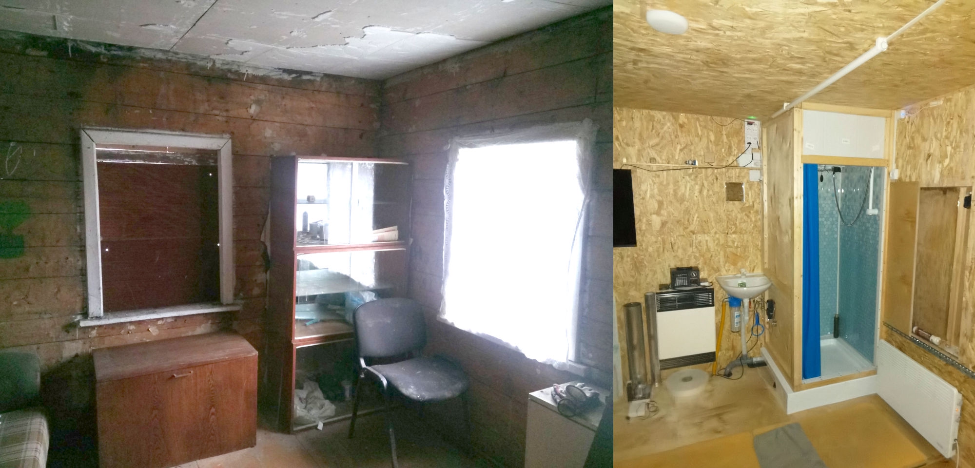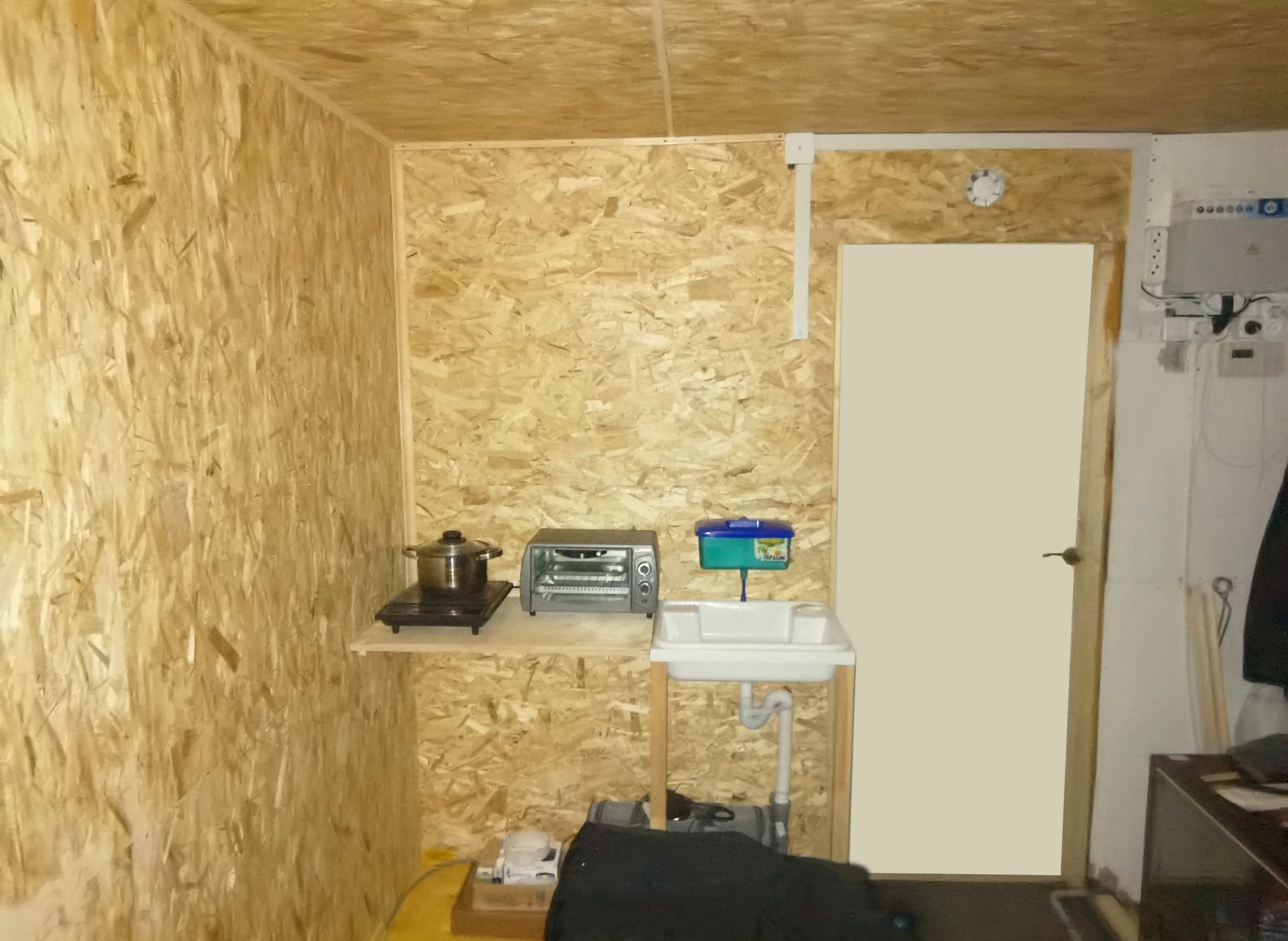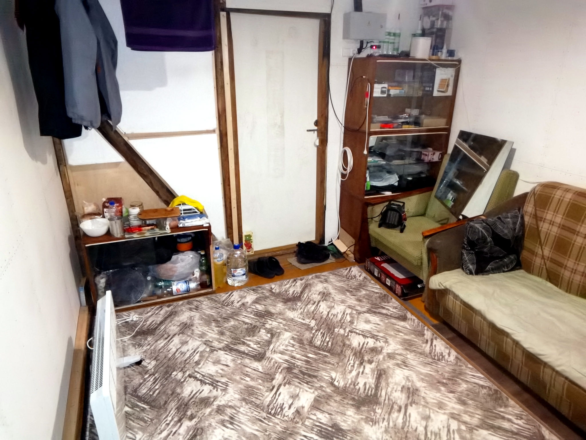 Пенопластом 100мм. Вот на фото видно. Моя первая зимовка в феврале 2024-го выглядела так. Полы, стены и потолки ещё не были обшиты. Заклеил щели в полах армоскотчем, постелил ковёр, и так зимовал две зимы. Зимой было около 10-20 градусов мороза в самые холода, не Урал. Первую неделю обогревался тепловентилятором на 2 кВт. Думал взять на постоянку потолочный ик обогреватель, но остановился на конвекторе. И не прогадал. Ресанта ОК-2000 работает второй год, в режиме нон-стоп, всю осень, зиму и весну. В этом году в мае выбросил старый диван, который уже сыпался и мешал утеплению пола. Поэтому до сих пор сплю на полу, на лежанке из звукоизоляции 50 мм. Пол почти доделал, осталось достелить около 3х кв. метров. Стена, что на фото, за диваном, до сих пор не обшита OSB, а просто заколочена листами двп. В этом году сделал систему приточно-вытяжной вентиляции. Над дверью приточный канальный вентилятор, встроенный в стену. Вытяжной, на 12 вольт, стоит в душевой кабине. Если включать только вытяжку, то работает тихо и сильно не дует, что очень удобно. Приточный работает мощно и громко, хочу заказать на него умное реле с пультом на 4 уровня скорости. В приложении можно настроить периодическую вентиляцию или по событию. Освещение в комнате и в тамбуре тоже работает через умное реле. Утром включается свет в комнате, вечером, перед сном, сам отключается. В тамбуре свет включается на 10 минут и автоматом выключается - так настроил, а то иногда забываю выключить.