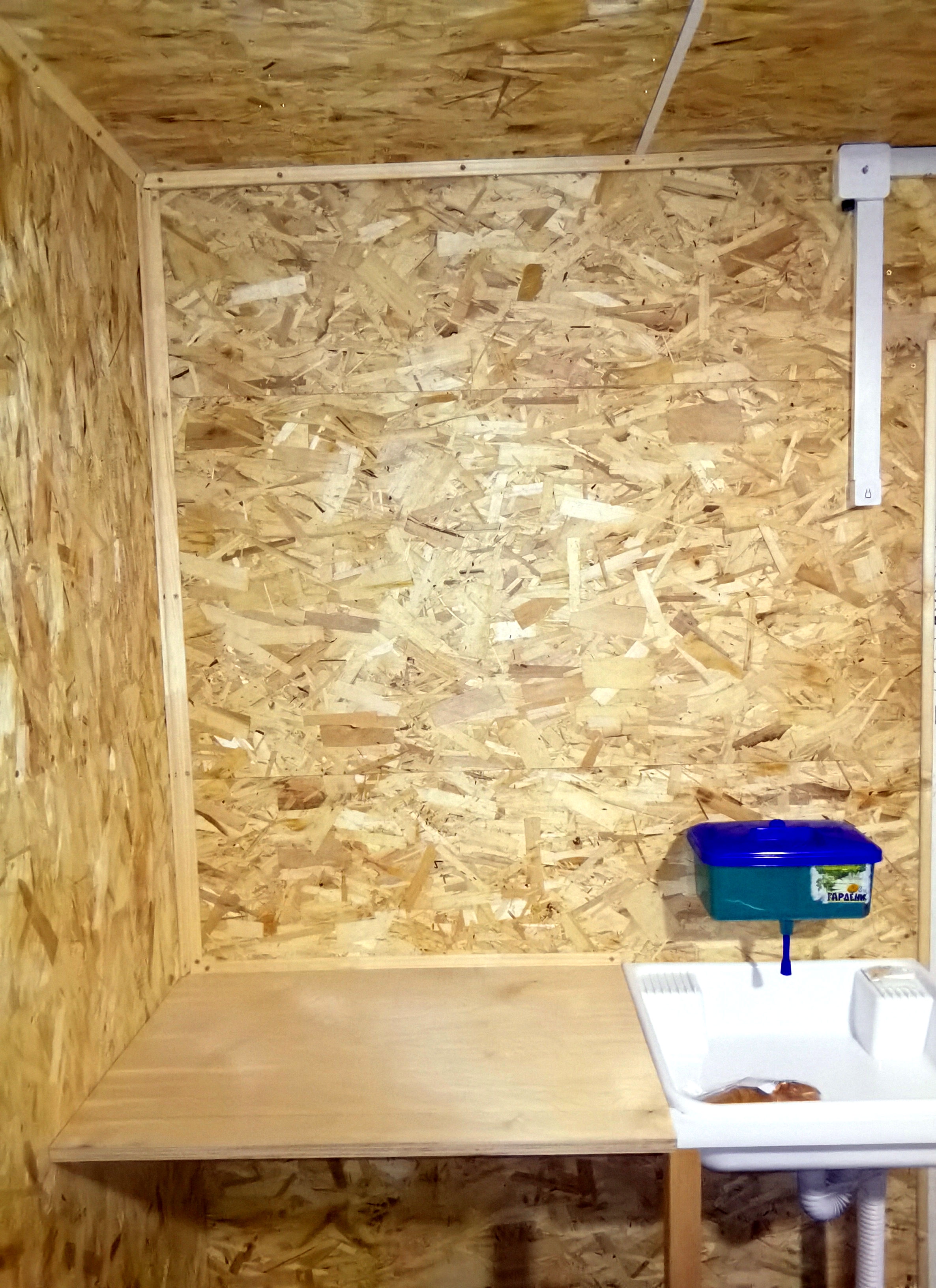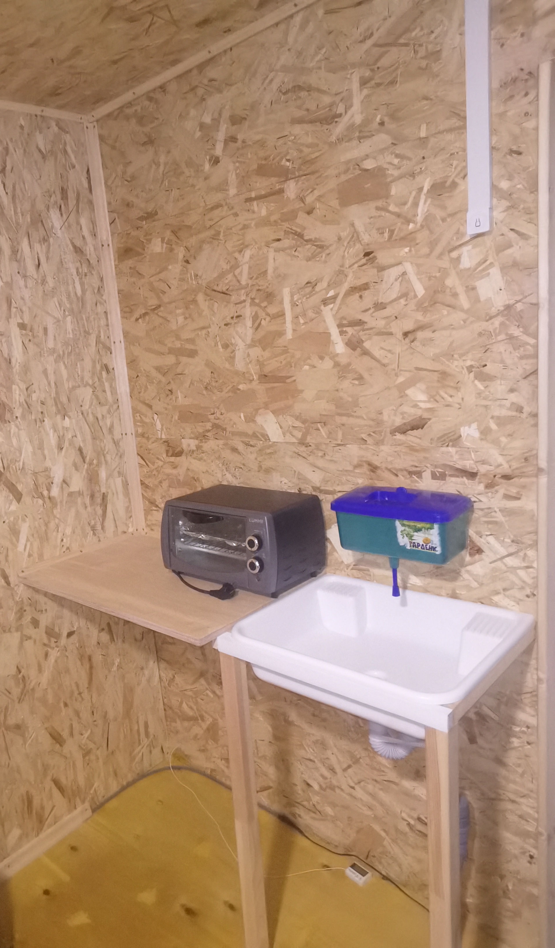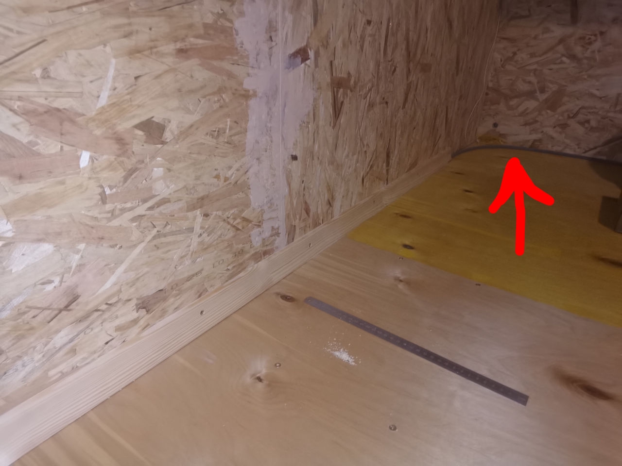Стена за кухонным уголком из 15й шпунтованной osb, утеплил 100мм пенопластом. Дом целиком пока не утеплен. Но щелей в доме нет - все щели я тщательно загерметизировал. Сейчас я сплю на полу с мая, так как выкинул старый диван, который уже сыпался и мешал доделать пол. В доме живу вторую зиму, плесень была в углах на полу, где не было ни фанеры, ни osb. Там, где фанера переходит в osb, плесени нет. На днях решил установить плинтус и вогнал в него тёплый кабель. Результат отличный. Сам придумал.