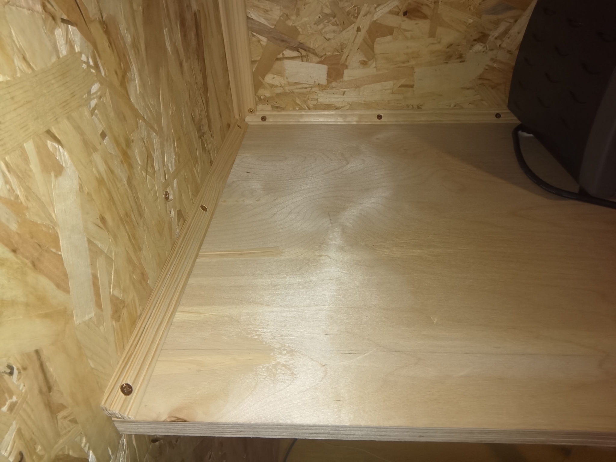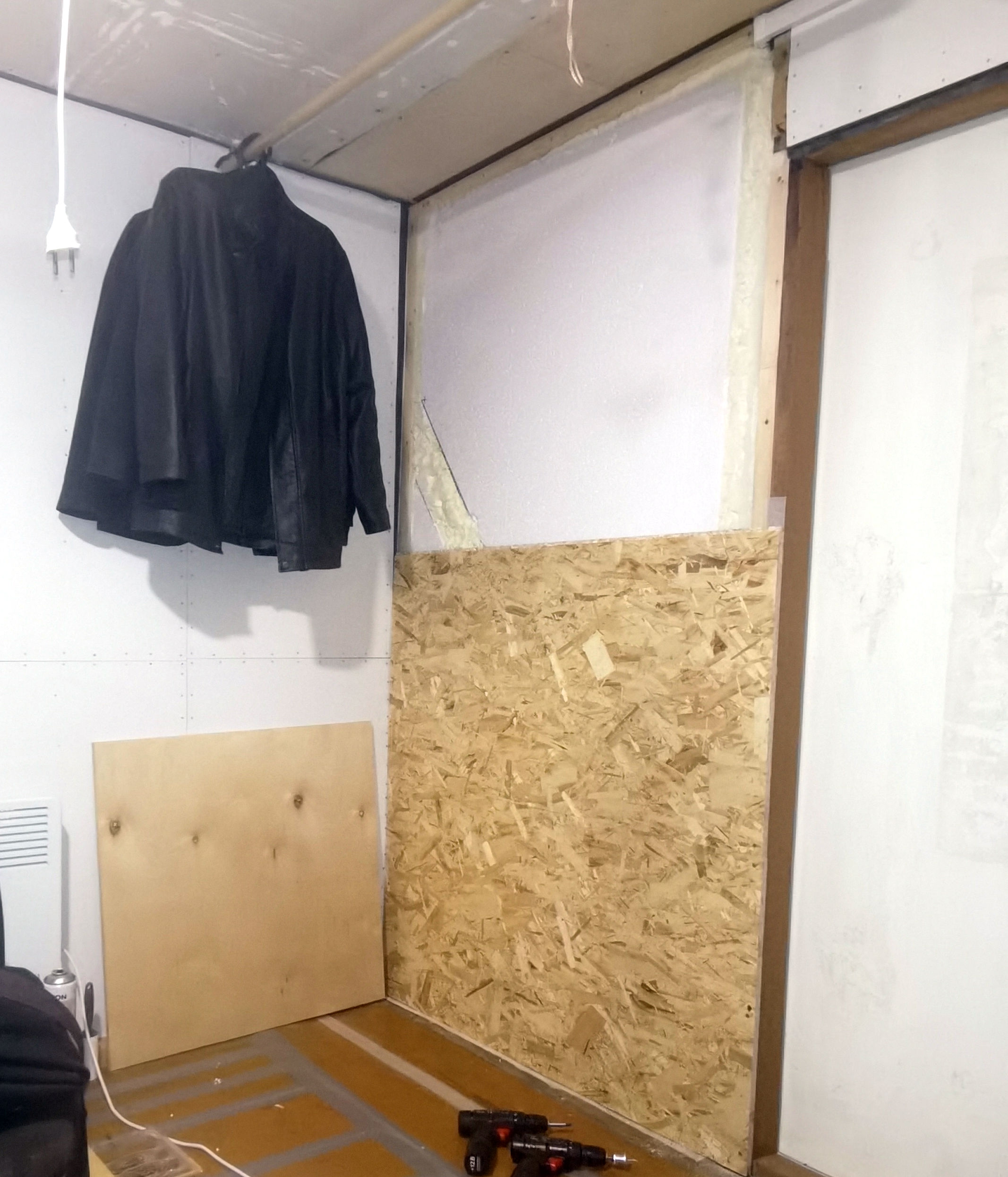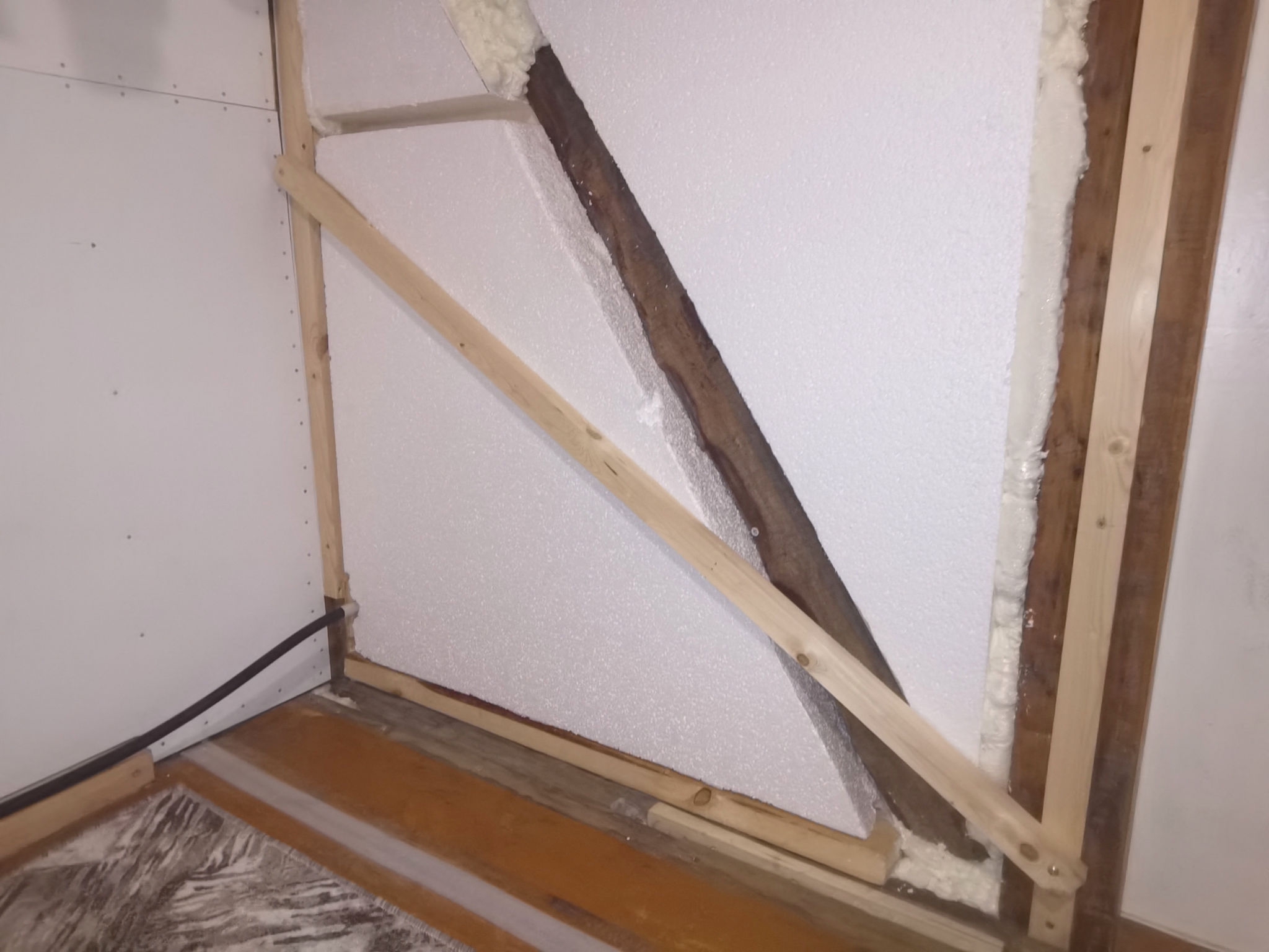 Стена за кухонным уголком из 15й шпунтованной osb, утеплил 100мм пенопластом. Дом целиком пока не утеплен. Но щелей в доме нет - все щели я тщательно загерметизировал. Сейчас я сплю на полу с мая, так как выкинул старый диван, который уже сыпался и мешал доделать пол. В доме живу вторую зиму, плесень была в углах на полу, где не было ни фанеры, ни osb. Там, где фанера переходит в osb, плесени нет. На днях решил установить плинтус и вогнал в него тёплый кабель. Результат отличный. Сам придумал.