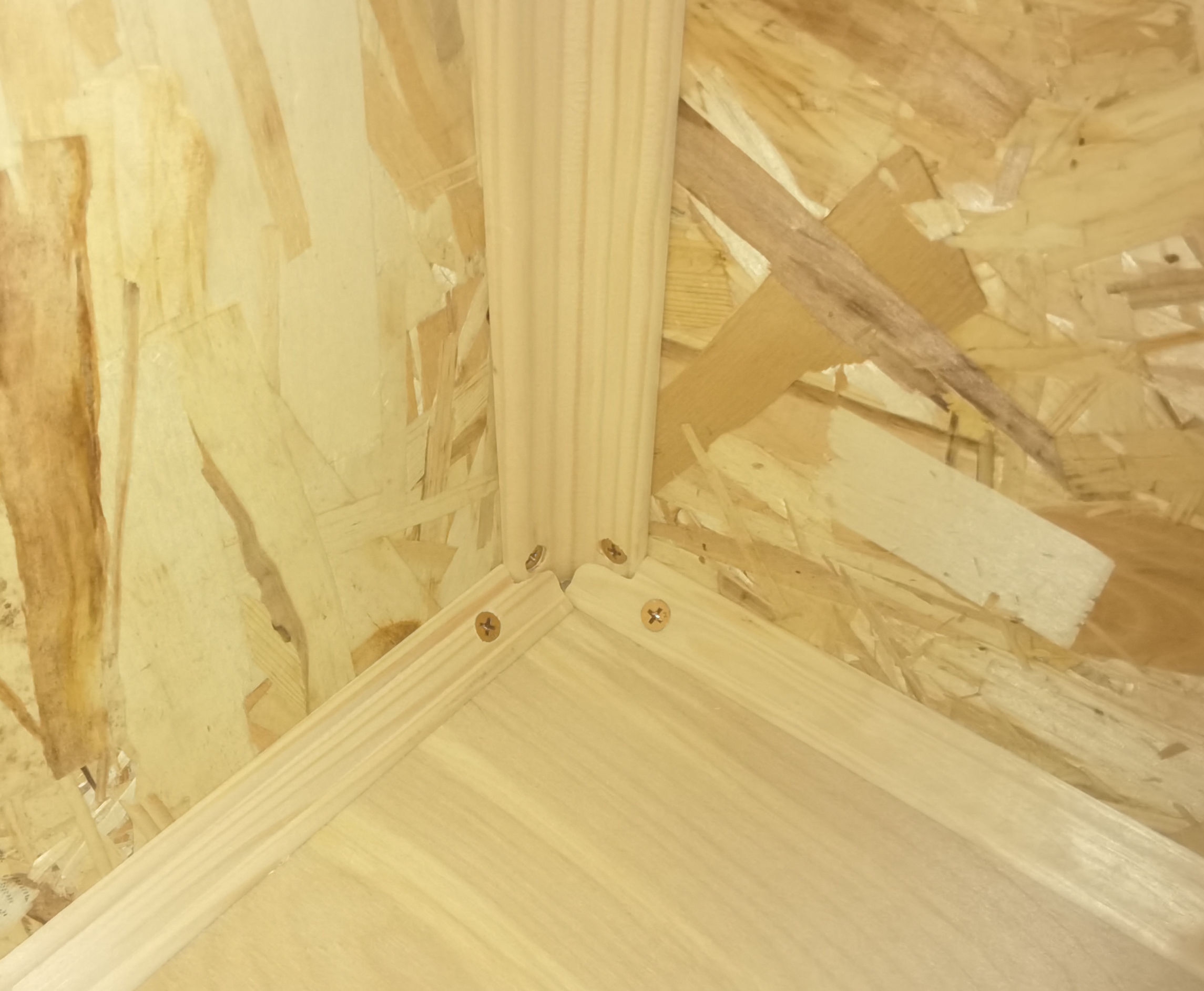 Купил раскладку, 18мм. Как раз под толщину фанеры. Углы пилил на стусле из Озона. Аккуратно засверлился. Получилось топово. Только дерево и саморезы, ничего лишнего. Идеальная кухня.