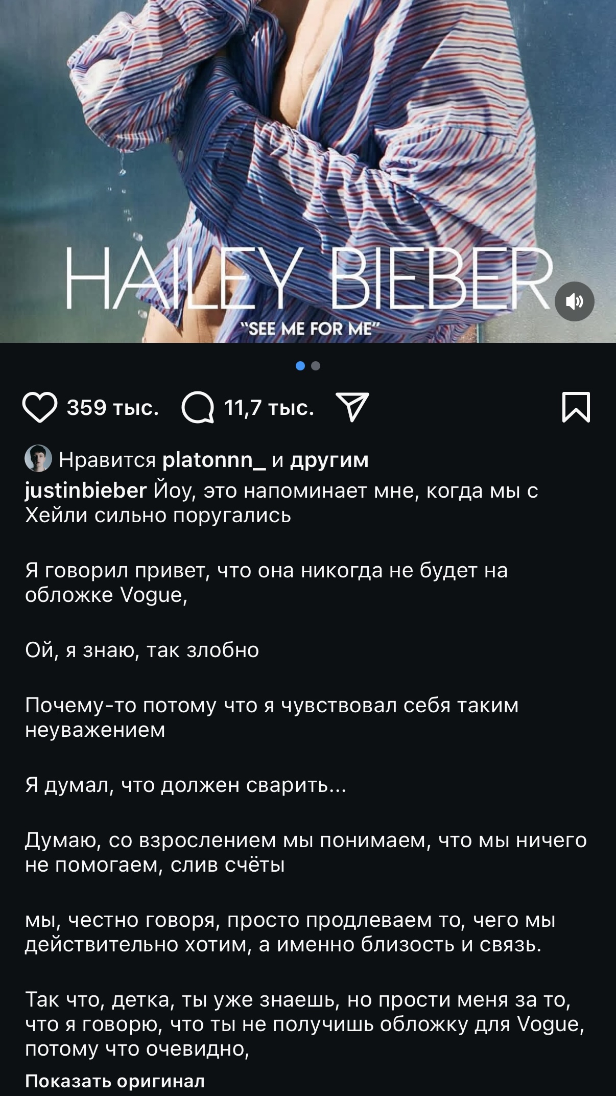 Бибер в ссоре с Хейли сказал ей, что она никогда не получит обложку в журнале Вог, а сейчас с ней выходит июньский выпуск. Перевод корявый правда, но суть уловить можно