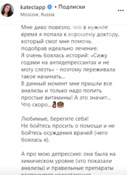 И еще я нашла, что в 21 году она писала, что типа "ура, слезла с адов" так что типа ждите. То есть в 21 году они начали пробовать зачать, вот тут я могу поставить анус. >>6127757 Я помню еще, что она постоянно там говорит про здоровье. Про анализ и здоровье. В общем-то это нормальная реакция человека, который на стадии принятия уже, а спустя год она уже приходит, если человек в терапии.