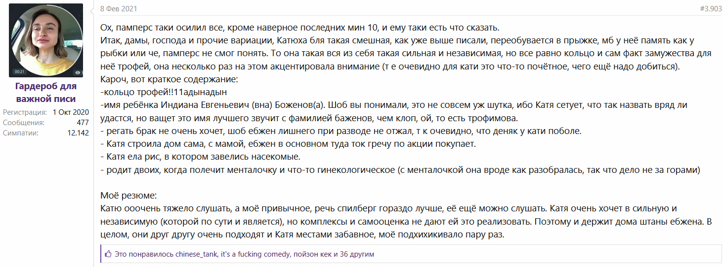 Но в целом я знаю, что в Муреначе много рнн домохозяек, так что про взамуж Клопа будут разгонять до последнего, и отрицать до последнего, хотя Клопыня не хотела роспись никогда, как теперь очевидно из интервью со Спилберг, которое до нас никогда не долетало почему-то.