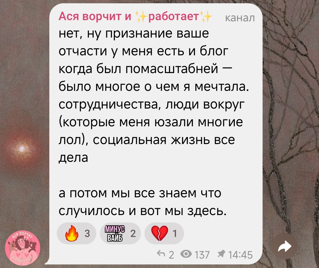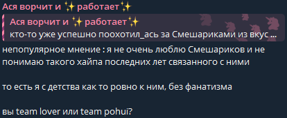 >>6129067 Она кстати когда сралась с другими подружками любила писать дерзкие посты типа. "Ну чё, встретила я эту, молча стояла даже в лицо мне ничо не сказала, так то"