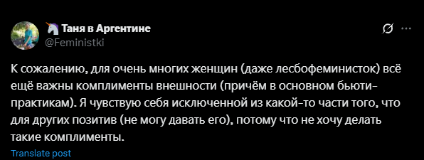 Для неё бьюти-практики это мытьё тела и головы, и в целом поддержание базовой гигиены. Ещё со сгнившей пастью что-то сделать - тоже «социальный конструкт». Там шиза полнейшая и прибеднение по всем фронтам.