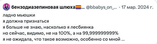 >>6130716 > там бишки на выебоне типа лесбы, эти яойщицы уже детей нянчат Ору. В нашем местном лгбт-сообществе (не ДСы) в 00-10-ые было дофига «тру лесбух», которые сейчас почти все взамужем и с детьми, даже дайригеи. А я всегда честно говорила, что бишка, и поэтому считалась не тру... со мной мутили только бишки. Зато потом многие тру лесбухи перепрыгнули на хуй и стали традвайфами, а бишки до сих пор бишки, лол.