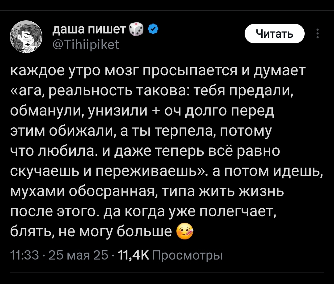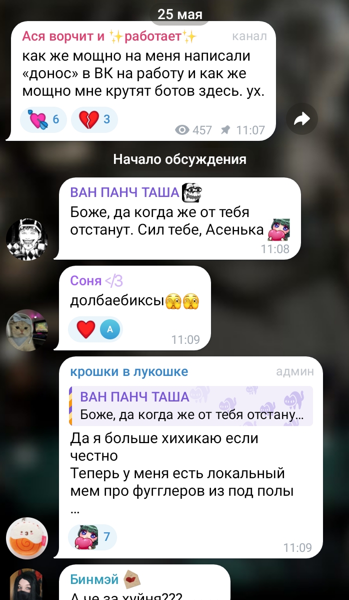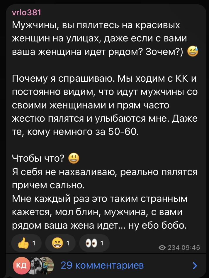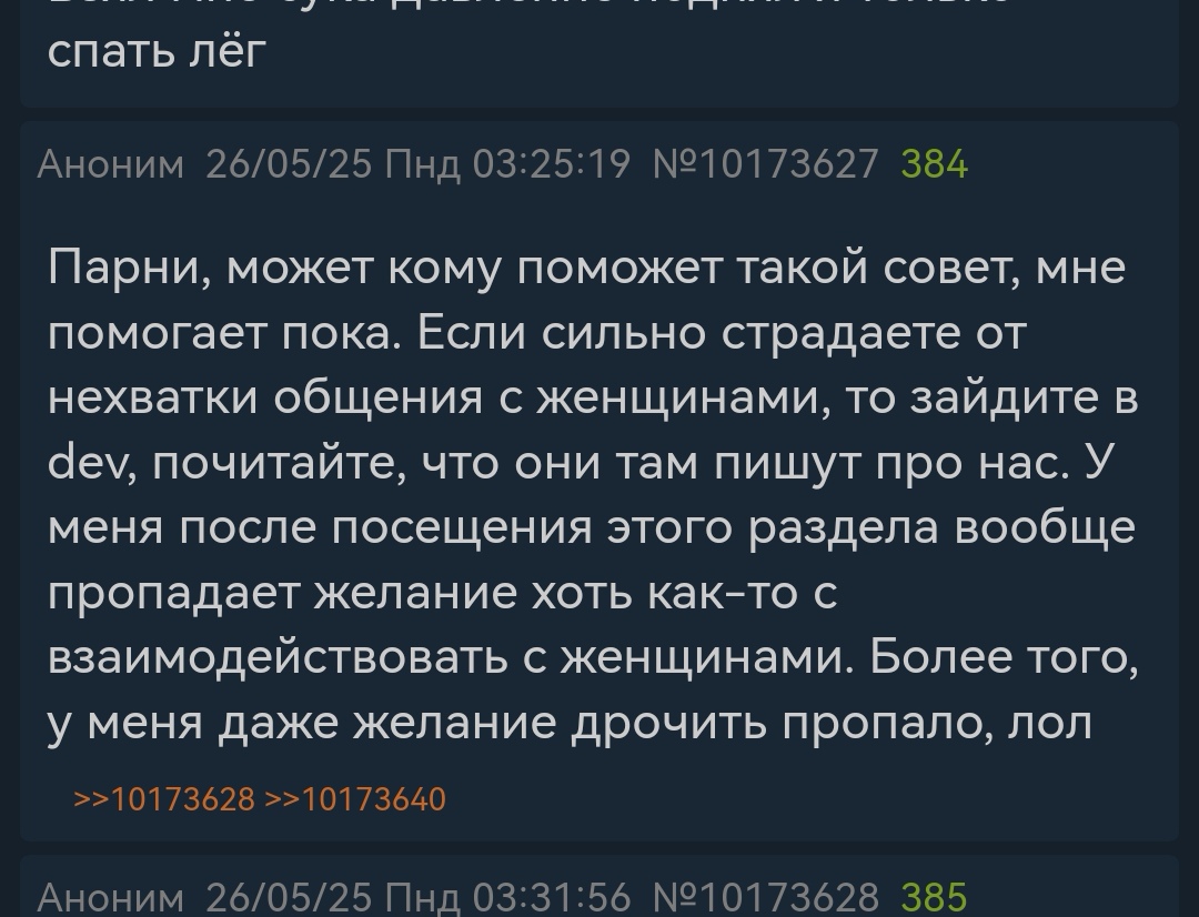 >>6134770 Я кстати начала так делать. Но только после того как увидела как хуи счастливы от смертей тянок. До двача даже поверить не могла что люди на такое способны. А сейчас всегда счастлива неудачам хуев. Кстати в верхнем интернете тоже потихоньку начинается такая тенденция. Вот вчера видела рилс, как хуй жаловался на измену жены, а тянки там ему навалили обвинений и хуесоссинга. Он наверное думал ему посочувствуют