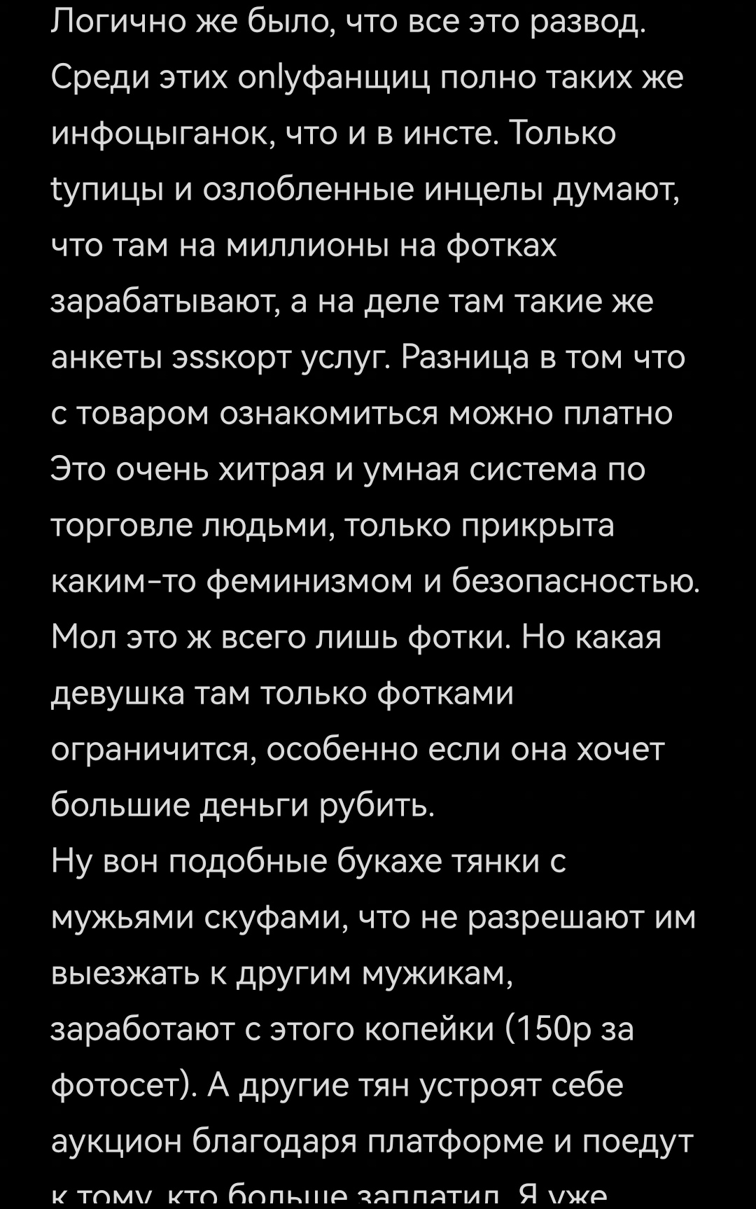 Сейчас на платформе примерно 4 миллиона «авторов контента». При этом в топе 10% средний заработок — всего 1000 долларов. Лишь меньше 1% женщин получают большие деньги, что и является главной рекламой всей индустрии.